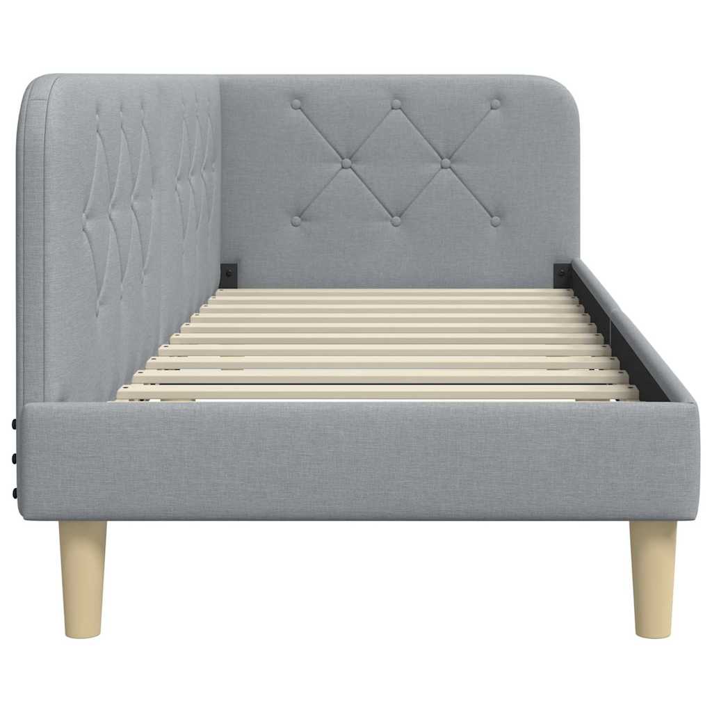 Dieses Stoff-Eckbettgestell ist ein modernes Tagesbett, das Platz für Entspannung und Schlaf bietet. Sein L-förmiges Design passt problemlos in jede Ecke eines Schlafzimmers und fungiert sowohl als stylisches Sofa als auch als gemütliches Bett. Ideal für alle, die Praktikabilität schätzen und dabei nicht auf Stil verzichten wollen ? dieser Bettrahmen bringt zeitgenössische Eleganz in verschiedene Raumkonfigurationen und ist die perfekte Wahl für kreative Wohnumgebungen. Materialien: Aus atmungsaktivem Stoff, Holzwerkstoffen und Sperrholz gebaut, bietet dieser Rahmen Robustheit und eine angenehme Oberfläche. Die Stoffbezüge strahlen Wärme aus und sind sowohl für den Sommer als auch den Winter geeignet, während die Holzwerkstoffe für Haltbarkeit und Stabilität sorgen. Enthaltene Komponenten: Beinhaltet einen stabilen Lattenrost, der gleichmäßige Unterstützung gibt und das Entspannen und Ausruhen optimiert. Tagsüber als Sofa und nachts als Bett, bietet der Rahmen Komfort für alle Ansprüche. Die Lattenroste verbessern die Luftzirkulation und halten die Matratze frisch und hygienisch. Merkmale/Funktion/Design: Mit seinem L-förmigen Design nutzt er den Raum optimal, passt in Ecken und schafft mehr Freiraum. Der kürzere Kopfteil kann auf beiden Seiten montiert werden, was die Flexibilität bei der Gestaltung erhöht. Mit einer standardmäßigen Betthöhe von 31 cm erfüllt er ergonomische Bedürfnisse und erleichtert den Übergang vom Sitzen zum Stehen. Empfohlene Verwendung: Perfekt für Schlafzimmer, die Wert auf Funktionalität in kompakten Wohnräumen legen oder wo jeder Zentimeter zählt. Wechselt leicht zwischen einem geselligen Sofa und einem bequemen Bett, bietet Platz für Gäste oder ermöglicht entspannte Alleinzeit. Das funktionale Design passt super zu urbanen, minimalistischen oder multifunktionalen Räumen. Pflege & Wartung: Einfach mit einem trockenen Tuch abwischen, um das Aussehen und die Stabilität zu erhalten. Diese einfache Pflegeanleitung unterstützt die Langlebigkeit und das makellose Aussehen und sorgt für eine angenehme Nutzbarkeit des Rahmens.