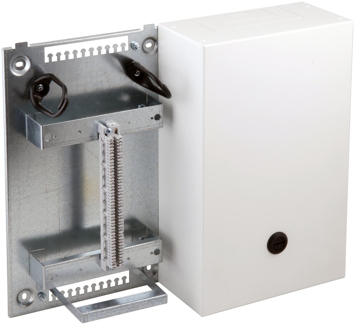 Bestehend aus einem Stahlblechverteiler mit Grundplatte und Haube mit Vorreiber-Verschluss. Mit eingebautem VKA-Montagesatz 20DA (für LSA-Anschlussmodule 1/20 zu 20DA).