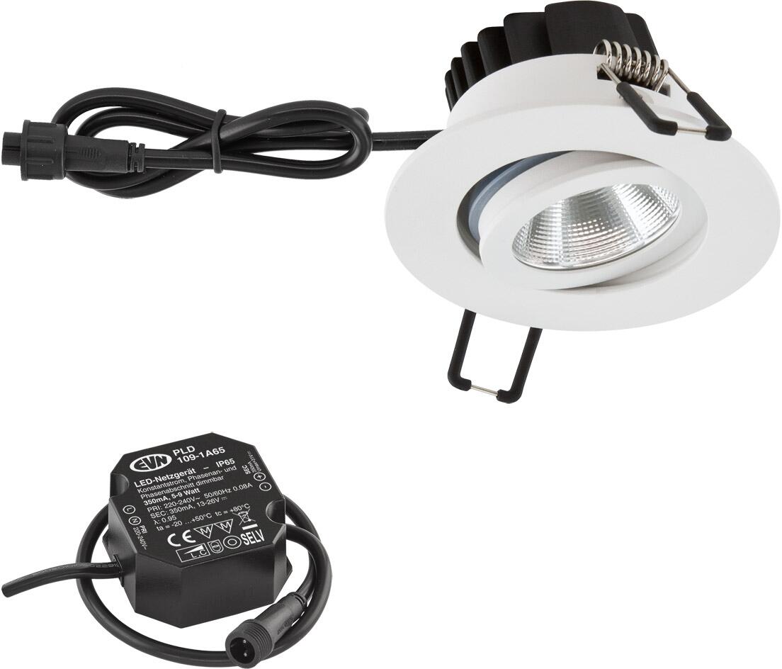 Mit der COB-LED Deckeneinbauleuchte lassen sich vielfältige Anwendungen im Innenbereich, wie z. B. Effektbeleuchtung, Raumbeleuchtung, Akzentuierte Beleuchtung und vieles mehr realisieren. Beim Einbau in geschlossene Decken erreicht die Leuchte die Schutzart IP65. Aufgrund dessen kann die Leuchte natürlich ebenso für Feuchtraum-Anwendungen und im Außenbereich eingesetzt werden. Zusätzliche Kosten für Leuchtmittel entfallen bei dieser Leuchte, da die Leistung von einem fest verbauten LED-Chip geliefert wird. Da im Lieferumfang das Netzgerät bereits enthalten ist, fallen auch hierfür keine zusätzlichen Kosten an. Der Schwenkwinkel beträgt 20°, Gehäusefarbe ähnlich RAL9003. tc: 75°C.