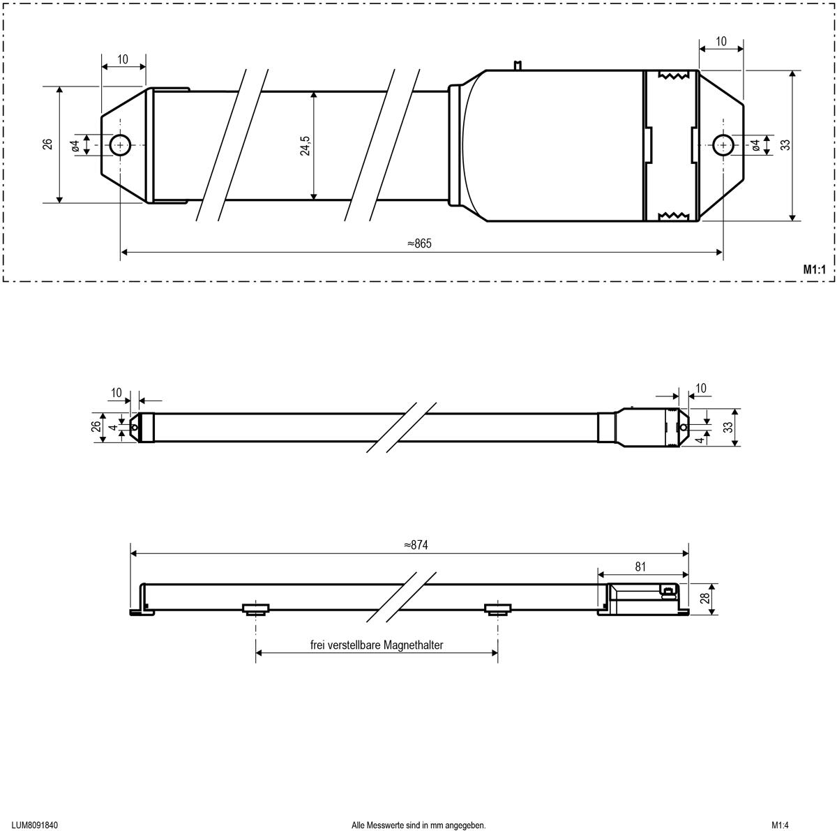 Mit dem LED-Sanierungseinsatz können vorhandene Leuchten unkompliziert auf LED umgerüstet werden. Zur vereinfachten Installation besitzt die Leuchte rückseitig zwei verstellbare Magnete, mit denen diese einfach an magnetischen Untergründen angebracht werden kann. Zusätzlich kann die Leuchte auch verschraubt werden. Da die Vorschalttechnik bereits integriert ist, muss kein zusätzlicher Platz für ein Netzgerät berücksichtigt werden. Es besteht zudem die Möglichkeit zur Durchgangsverdrahtung. Die Leuchte verfügt über einen Power-Switch (12/18W) bei einer Effizienz von 180lm/w. Das Gehäuse ist aus UV-beständigen PC gefertigt. L80B10 bei 100000h.