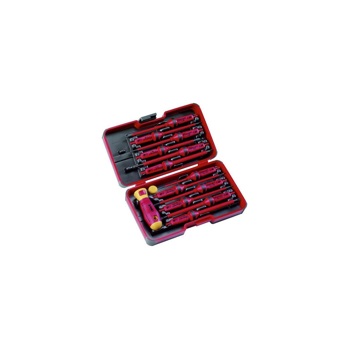 E-Smart VDE Wechselklingen-Set, Das erste kompakte smart-Werkzeug für Elektriker.12 IEC Wechselklingen mit 2Komponenten-Griff in robuster smart Box. Aufsteckbare Drehkappe und Weichmantelzone für Einsatz als Feinwerkzeug.Sicherer Halt der Klingen im Griff, automatische Verriegelung gegen ungewolltes Herausziehen; Sicherheitswerkzeug nach DIN ISO 60900 - alle Schraubendreher stückgeprüft mit 10.000 Volt