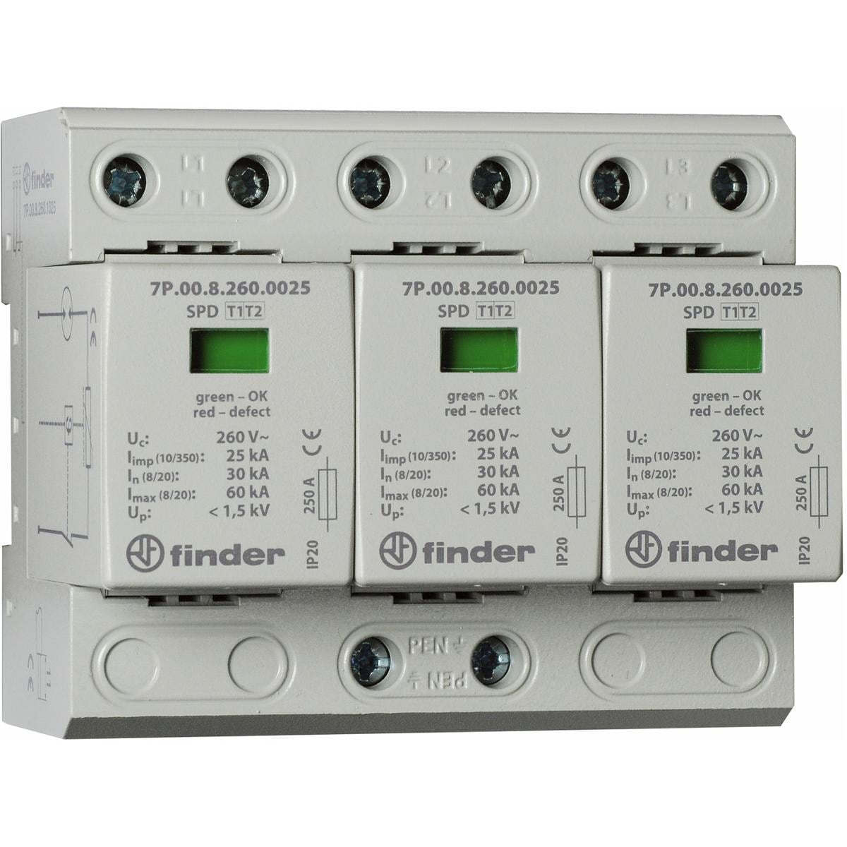 Überspannungsableiter Typ 1 + 2, Kompaktgerät. Varistor und Funkenstrecke in Serie zwischen L1, L2, L3 - PEN. Für 3-phasige TN-C-Netze. Breite 108 mm.