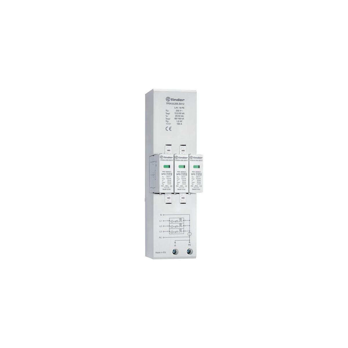Blitz- und Überspannungsableiter Typ 1+2 für 40 mm Sammelschiene, 12,5 kA pro Pfad, 5-Leitersystem, L1, L2, L3, N, PE, austauschbares Modul, optische Defektanzeige, Haltesystem für die Module, für Sammelschienen 40 mm, einsetzbar für die Ableitung von Blitzströmen bis 7,5 kA pro Pol.