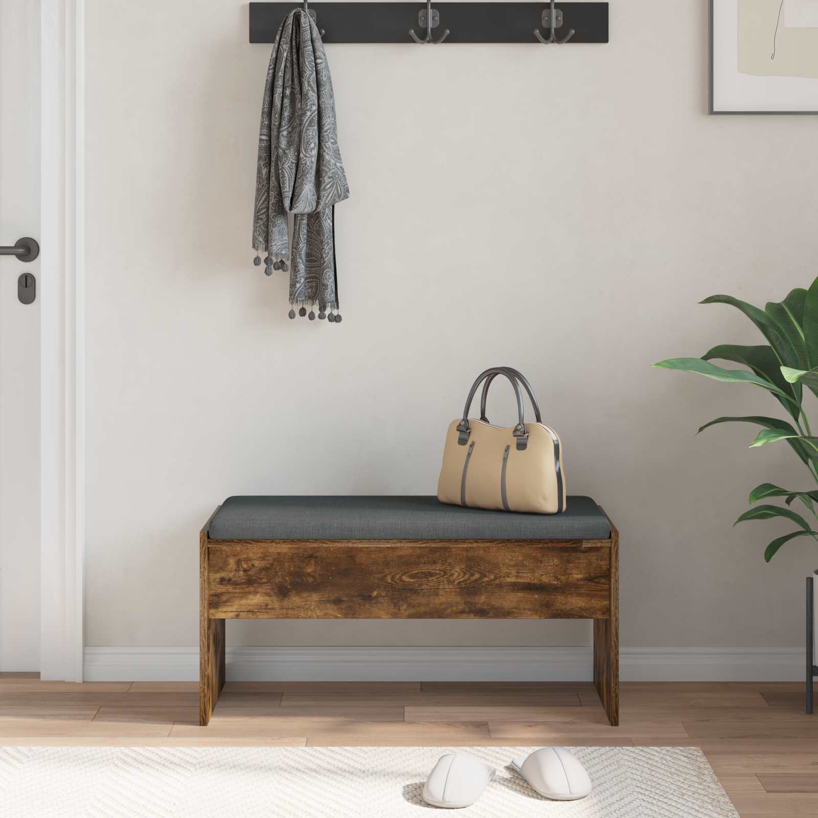 Diese flurbank verbindet Stil und Funktion in einem modernen, rechteckigen Design, das jeden Flur oder Eingang aufwertet. Mit klaren Linien und minimalistischem Look hat sie die richtige Ästhetik für alle, die einfache und praktische Möbel mögen. Egal ob im Flur oder Eingangsbereich, diese Bank bietet nicht nur einen Platz zum Sitzen, sondern sieht auch gut aus und lädt Familie und Gäste zum Entspannen ein. Materialien: Die Bank besteht aus robustem Holzwerkstoff, der Stabilität und eine schöne Holzmaserung bietet. Die solide Bauweise sorgt dafür, dass sie lange hält und eine tolle Ergänzung für dein Zuhause ist. Die schicke Holzoberfläche passt perfekt zum modernen Design der Bank und sieht gleichzeitig gut aus und ist widerstandsfähig. Weiches Kissen: Mit einer bequemen Polsterung lädt diese Bank geradezu zum Sitzen ein. Der Stoff sorgt für eine angenehme Textur und macht jede Pause oder Wartezeit total bequem, ideal für den täglichen Gebrauch. Robuste Bauweise: Diese Bank hat einen stabilen Aufbau, der dir guten Halt gibt. Die quadratischen Beine aus Holzwerkstoff sorgen für eine feste Grundlage und machen sie zur perfekten Wahl für stilvolle Möbel. Simplicity & Funktionalität: Das moderne Design überzeugt durch klare Linien und weniger Schnickschnack, sodass diese Bank in jeden modernen Raum passt. Sie ist ideal für alle, die den Platz gut nutzen wollen, ohne dabei auf Stil zu verzichten. Pflege & Wartung: Die Pflege ist ganz einfach; einfach mit einem feuchten Tuch abwischen, um sie sauber zu halten. Keine aufwendige Reinigung nötig, damit die Bank immer ein schickes Element in deinem Zuhause bleibt.
