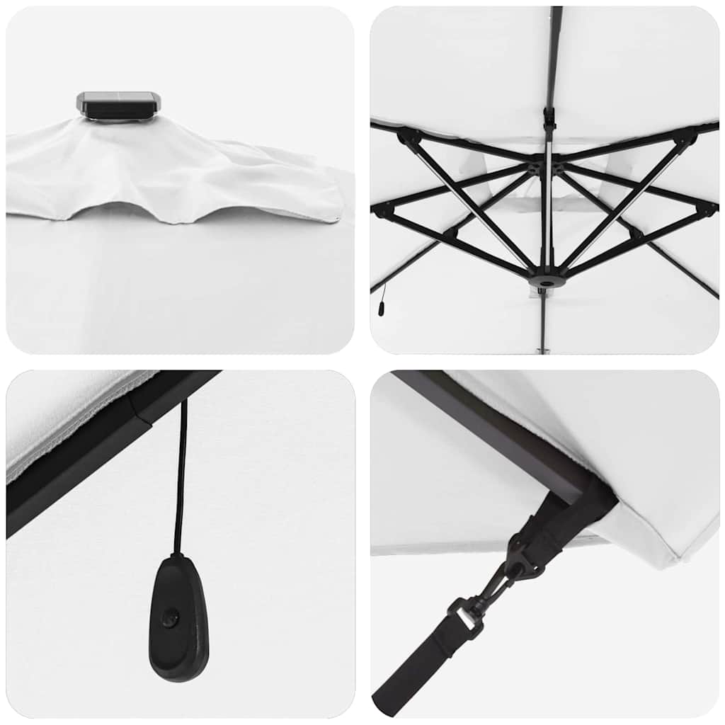 Dieser freischwingende Sonnenschirm verbindet Funktionalität mit schickem Design und ist perfekt für jeden Außenbereich. Der stylische Sandschirm aus robustem 200G Polyester bietet viel Schatten und ist eine Top-Wahl für entspannte Nachmittage auf deinem Balkon oder deiner Terrasse. Widerstandsfähige Stabilität: Hat einen Kreuzfuß, der das Umkippen verhindert und an windigen Tagen für Stabilität sorgt. Der schwere Aufbau hält ihn auch bei schlechten Wetterbedingungen stand. Solarbetriebene LEDs: Beleuchte deine Treffen mit den integrierten solarbetriebenen LED-Lichtern und schaffe eine gemütliche Stimmung am Abend, perfekt für Dinnerpartys oder zum Entspannen nach einem langen Tag. Einfach verstellbare Neigung: Der Sonnenschirm bietet dir einfache Anpassungsmöglichkeiten für den Schatten, sodass du ihn im Laufe des Tagesjustieren kannst, um optimalen Schutz zu gewährleisten. Bequeme Kurbelbetätigung: Das Design mit dem Kurbelgriff macht das Öffnen und Schließen des Schirms super einfach und benutzerfreundlich. Robuste Materialien: Hergestellt aus hochwertigem, pulverbeschichtetem Stahl und rostbeständigem Aluminium, ist der Sonnenschirm für den Außenbereich konzipiert und bietet dir langanhaltenden Spaß.