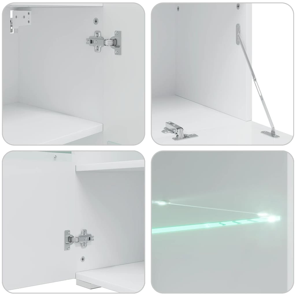 Dieses Komplettset von Wand-Vitrinen wird Ihr Wohnzimmer großartig ergänzen und es ohne Abstriche am Stil optimieren. Das Möbelset, das aus einem Wandschrank, einem freistehenden Schrank, zwei TV-Schränken und einem wandmontierten Regal besteht, bietet ausreichenden Platz zur Lagerung Ihrer Multimediageräte, Bücher und aller anderen Arten von kleineren Gegenständen. Es ist auch für die Anzeige von dekorativen Gegenständen, Fotorahmen oder sogar Topfpflanzen ideal geeignet. Die TV-Schränke mit Klapptüren bieten reichlich Platz, um Ihre Bücher, Notwendiges, Medienträger, usw. ordentlich zu organisieren. Der Wandschrank und der freistehende Schrank sind mit einer teilweise verglasten Tür und drei Regalen ausgestattet, einschließlich eines Glasregals mit energiesparender, weißer LED-Beleuchtung. Unser Wandvitrinen-Set ist aus qualitativ hochwertigem Holzwerkstoff mit mattweißer Lackierung gefertigt, während die Hochglanzoberfläche der Frontplatten zum zeitgemäßen Look dieses Sets beiträgt, das zu jeder Inneneinrichtung passen wird. Die Montage ist einfach. Die Lieferung umfasst auch Montagezubehör. Bitte beachten Sie, dass das TV-Möbel aus zwei Schränken besteht.