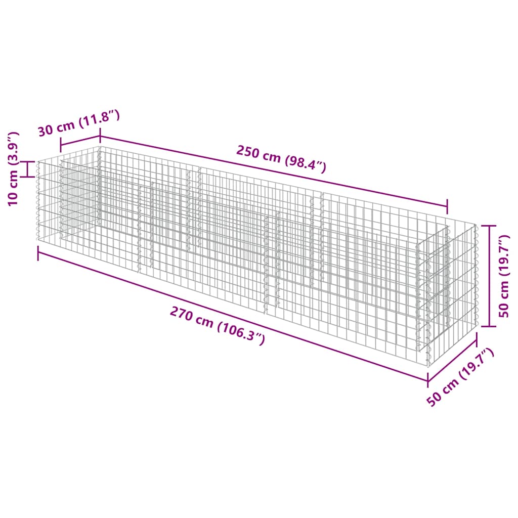Mit diesem Gabionen-Hochbeet können Sie ein stabiles, aber dennoch stilvolles Blumen- oder Hochbeet anlegen, z.B. als Begrenzung in Ihrem Garten oder Hof. Der robuste Drahtkorb ist so konzipiert, dass er mit Steinen oder Kies gefüllt werden kann. Das Hochbeet wird aus rostfreiem und witterungsbeständigem, verzinktem Stahl hergestellt und ist daher sehr stabil und langlebig. Das Maschengitter wird durch Verschweißen der Quer- und Längsdrähte an jeder Verbindungsstelle noch mehr verstärkt und ist dadurch extra stabil. Bitte beachten Sie, dass die Steine und Pflanzen nicht im Lieferumfang enthalten sind.