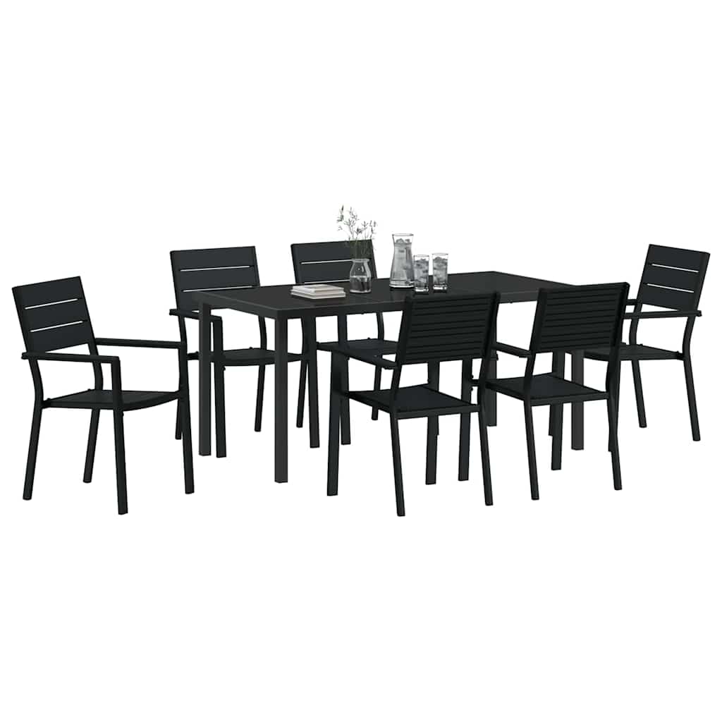 Dieses moderne Garten-Esszimmer-Set vereint Stil und Funktionalität und ist der perfekte Ort, um draußen zu essen ? egal ob im Garten oder auf der Terrasse. Mit seinem schlanken, minimalistischen Design sieht es einfach elegant aus und die robuste Bauweise macht es wetterfest für jede Saison. Pulverbeschichtetes Stahlmaterial: Das Set wird aus hochwertigem pulverbeschichtetem Stahl hergestellt, der für seine Langlebigkeit bekannt ist. Die Pulverbeschichtung sorgt für ein tolles Finish und schützt das Metall vor Nässe und UV-Strahlung. Es bleibt auch bei intensivem Gebrauch und schlechtem Wetter chic. Funktionale Komponenten: Jedes Teil des Sets wird präzise gefertigt. Die Armlehnen sind bequem, der stabile Rahmen sorgt für Sicherheit und die Beine bieten genug Halt. Zusammen schaffen sie einen coolen Look und ein praktisches Design, das deine Outdoor-Mahlzeiten verbessert. Moderne Designmerkmale: Die moderne Ästhetik vereint klare Linien mit praktischen Funktionen und macht es zu einem passenden Stück für jeden zeitgemäßen Außenbereich. Schwarz fügt sich gut in jede Gartendekoration ein und bringt Eleganz mit. Vielseitige Nutzung: Ideal für Frühlings- und Sommerfeiern ? dieses Esszimmer-Set passt sowohl zu Familienessen als auch zu kleinen Zusammenkünften. Es fügt sich problemlos in Gärten, Terrassen und Balkone ein und ist anpassungsfähig für jede Art von Anlass. Pflege & Wartung: Um die Langlebigkeit zu garantieren, solltest du eine Abdeckung benutzen, wenn es nicht in Gebrauch ist. Es benötigt wenig Pflege; das Material trocknet schnell, sodass es nach einem Regen oder der Reinigung schnell wieder bereit ist.
