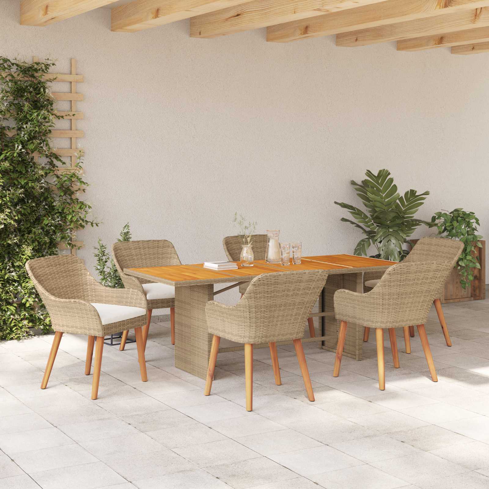 Dieses schicke Garten-Esszimmer-Set ist perfekt für alle, die ihren Außenbereich mit Stil und Komfort aufpeppen möchten. Es ist ideal für Gärten und Terrassen und verbindet modernes Design mit funktionalen Elementen, um einen gemütlichen Essbereich für gesellige Zusammenkünfte im Freien zu schaffen. Die klaren Linien und der minimalistische Stil machen es vielseitig für verschiedene dekorative Themen und bieten gleichzeitig zuverlässige Leistung und Komfort. Sein ansprechendes Design ist bei Hausbesitzern beliebt, die nach einer praktischen und gleichzeitig luxuriösen Lösung für das Esszimmer im Freien suchen. Hochwertige Materialien: Das Esszimmer-Set besteht komplett aus Poly-Rattan, das für seine Langlebigkeit und optische Anziehungskraft bekannt ist. Dank der UV-Beständigkeit bleibt die Farbe auch bei direkter Sonneneinstrahlung lebendig. Das pulverbeschichtete Stahlgestell sorgt für zusätzliche Stabilität und hält den Witterungsbedingungen problemlos stand. Vollständiges Set: Jede Sitzgelegenheit bietet eine bequeme Rückenlehne und Armlehnen aus Poly-Rattan, die ergonomisches Sitzen ermöglichen und längere Essenszeiten angenehm gestalten. Alle Teile, vom Tisch bis zu den Stühlen, harmonieren hervorragend und schaffen eine einladende Atmosphäre. Moderne Funktionalität: Mit klaren, modernen Linien strahlt das Esszimmer-Set schlichte Eleganz aus. Es passt sich perfekt an zeitgenössische sowie traditionelle Außenbereiche an. Funktional, ohne überladen zu sein, verkörpert es das moderne Möbeldesign. Vielseitige Einsatzzwecke: Ideal für Gartenfeste, entspannte Abende und einsame Kaffeemomente. Es passt sich mühelos an verschiedene Anlässe an, von intimen Abendessen bis hin zu entspannten Rückzugsorten. Seine Vielseitigkeit unterstreicht seinen großartigen Wert. Einfache Pflege: Die Pflege ist simpel ? einfach mit einem feuchten Tuch abwischen. Regelmäßige Reinigung verlängert die Lebensdauer und behält das makellose Aussehen, was eine einfache Handhabung für den Benutzer bedeutet.