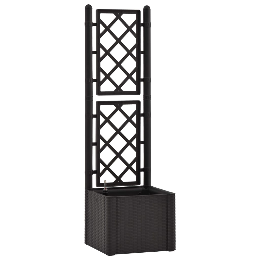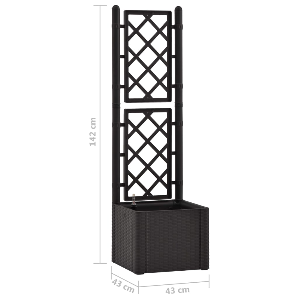Schaffen Sie einen schönen Hingucker mit diesem eleganten, funktionalen und einzigartigen selbstbewässernden Hochbeet! Dieser Spalier-Pflanzkübel hat einen großen Blumenkasten, der eine große Anzahl grüner Pflanzen und Blumen aufnehmen kann. Das eingebaute Spalier bietet eine hervorragende Stütze für Kletterpflanzen wie Kräuter, Tomaten, Bohnen usw. Es besteht aus robustem UV-, wetter- und frostbeständigem Kunststoff und ist für den Innen- und Außenbereich geeignet. Das Design ähnelt einer täuschend realen Rattanstruktur. Das Material ist waschbar und leicht zu reinigen. Darüber hinaus kann diese Box Pflanzen automatisch gießen, indem sie Feuchtigkeit aus ihrem 35-l-Wasserreservoir ableitet, und verfügt über Wasserüberlauflöcher, um ein Überwässern zu verhindern. Die Füllstandsanzeige ist enthalten.