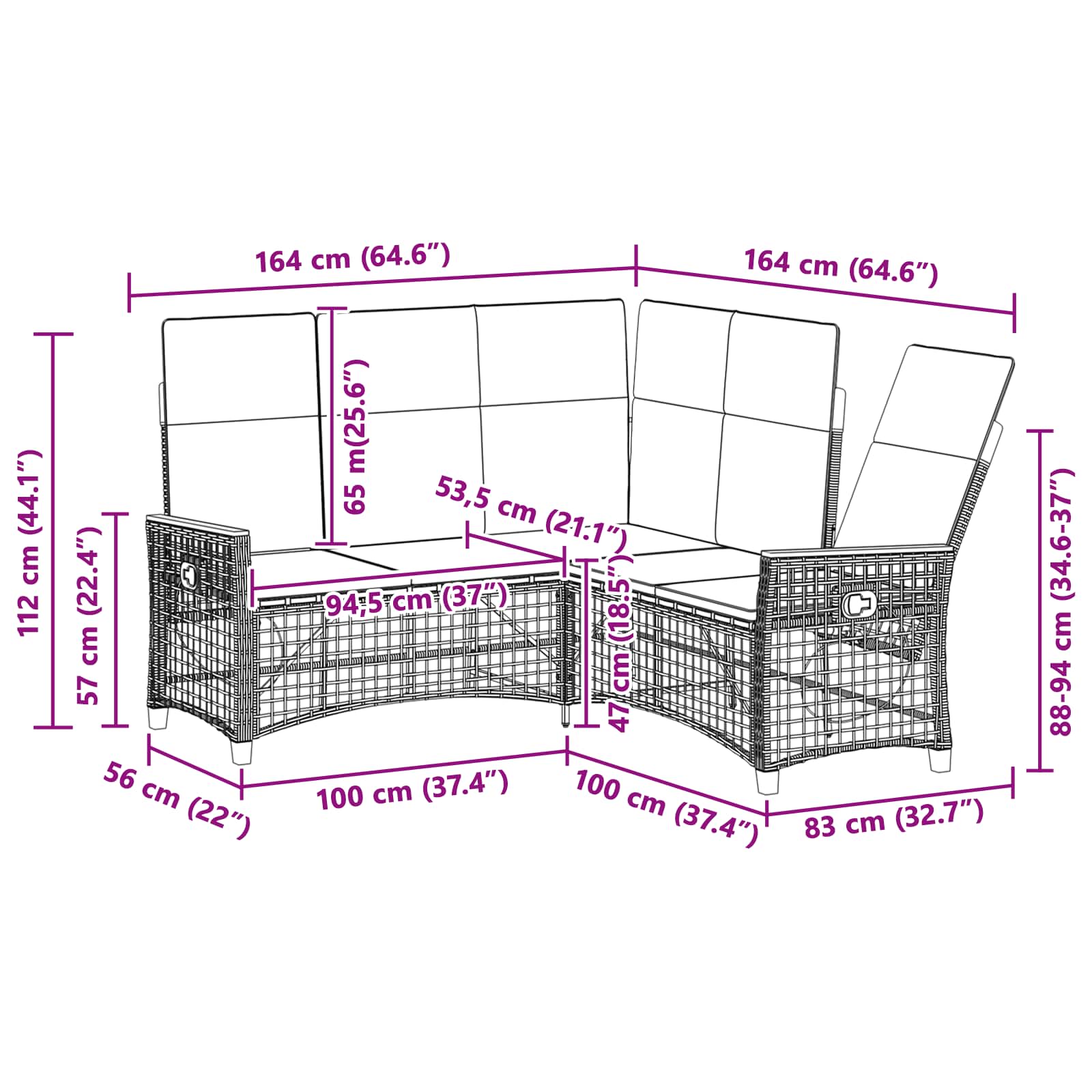 - 1 x Reclining Sofa: 164 x 164 x 88/94/112 cm (L x B x H)