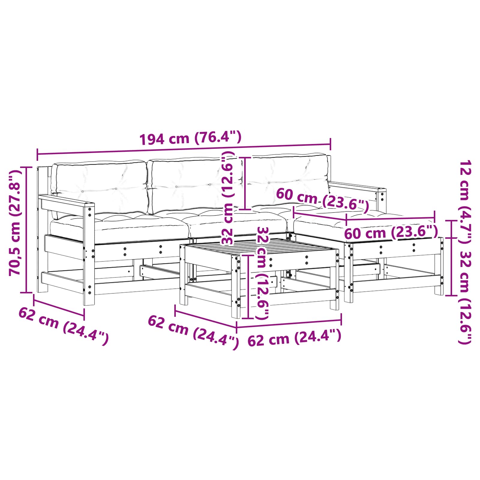 - 1 x Mittelsitz: 62 x 62 x 70,5 cm (L x B x H)