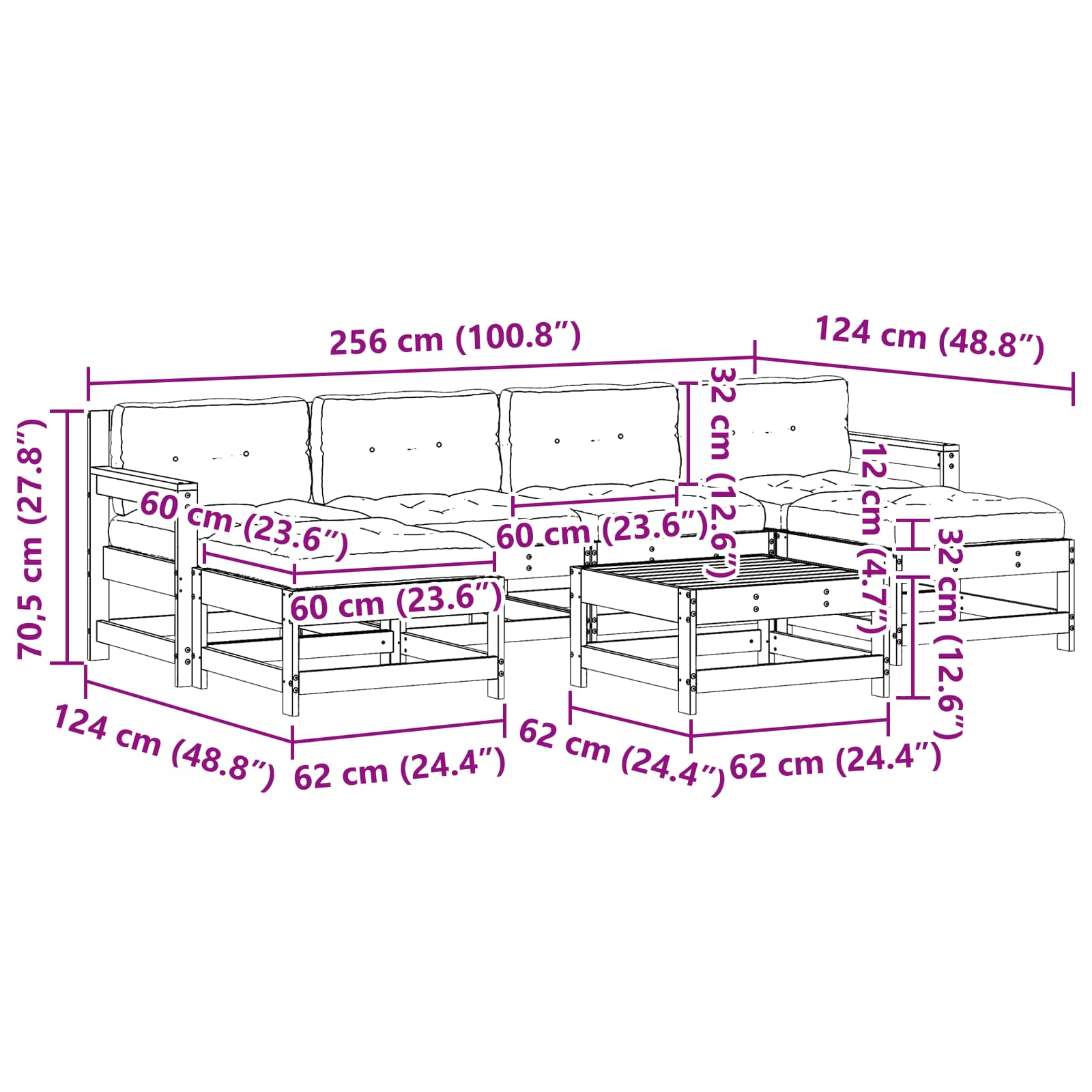 - Gesamtabmessungen: 256 x 124 x 70,5 cm (L x B x H)