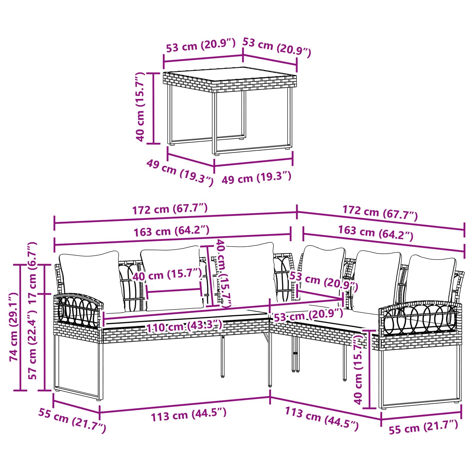 Dieses moderne Garten-Sofaset verwandelt dein Leben im Freien mit seinem klaren Design und der robusten Bauweise. Es bereichert deinen Garten, deine Terrasse und Poolbereiche ? perfekt für entspannte Gespräche oder ruhige Abende im Freien. Mit seiner stilvollen und gleichzeitig funktionalen Silhouette ist es ein echter Hingucker in deiner Outdoor-Deko, egal ob beim Grillen oder unter dem Sternenhimmel. Robuste Bauweise: Das Sofaset aus Poly-Rattan und Stahl ist stabil und für den täglichen Einsatz im Freien gemacht. Diese wetterfeste Kombi sorgt dafür, dass die Möbel allen Wetterbedingungen trotzen und lange halten. Glasoberflächen: Der Tisch mit gehärteter Glasoberfläche bietet nicht nur eine schicke, sondern auch pflegeleichte Fläche für Speisen oder Deko. Das Glas ist sicher verarbeitet, um Stöße und Verschüttungen zu vermeiden und vereint Funktionalität mit Stil für deine Outdoor-Veranstaltungen. Poliesterkissen: Mit den weichen, wetterfesten Polyesterkissen bietet dieses Set hervorragenden Komfort und hält mehrere Saisons lang. Die Kissen sind schimmelresistent und verblassen nicht, sodass du lange Freude daran hast. Flexible Anordnung: Das modulare Design ermöglicht dir, das Set nach deinen Wünschen anzuordnen, egal ob für intime Gespräche oder große Feiern. Die L-Form nutzt den Platz optimal aus und schafft Flexibilität im Außenbereich. Pflegehinweise: Mit abnehmbaren Kissenbezügen ist die Reinigung ein Kinderspiel und hält deine Möbel frisch. Wische die Metall- und Glasoberflächen regelmäßig mit einem milden Reiniger ab, damit sie auch in Zukunft toll aussehen.