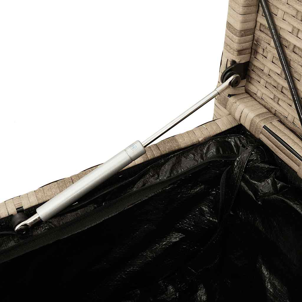 Diese Sitzbank bietet nicht nur eine bequeme Sitzgelegenheit im Außenbereich, sondern eignet sich auch perfekt, um Gartenkissen, Gartengeräte, Handtücher und andere Gegenstände ordentlich und griffbereit aufzubewahren. Langlebiges Material: PE-Rattan, auch als Poly Rattan bekannt, ist ein robustes, pflegeleichtes synthetisches Material, das die Optik von natürlichem Rattan aufweist. Es kennzeichnet sich durch ein geringes Eigengewicht und lässt sich einfach reinigen. Aufgrund seiner Haltbarkeit und Witterungsbeständigkeit wird es häufig bei der Herstellung von Gartenmöbeln verwendet.Stauraum: Der Gartenhocker verfügt über einen Stauraum an der Unterseite, der mit einem wasserfesten Beutel zur Aufbewahrung von Kissen, Spielzeug und anderen Gegenständen ausgestattet ist. Der innere Beutel kann mit Klettverschlüssen sicher am Sitz befestigt werden, was für Stabilität sorgt und Bewegungen verhindert.Sicheres und einfaches Öffnen und Schließen: Die Gasfeder erleichtert das Öffnen des Deckels und verhindert das Einklemmen der Finger.Bequemes Sitzerlebnis: Dieser Gartensessel mit dick gepolsterten Kissen bietet ein angenehmes Sitzgefühl.Abnehmbarer und waschbarer Bezug: Diese Sitzkissen verfügen über abnehmbare Bezüge für einfaches Waschen und Pflegen. Gut zu wissen:Wir empfehlen dir, deine Gartenmöbel mit einer wasserdichten Hülle zu schützen, um lange Zeit eine ansprechende Optik aufzuweisen.