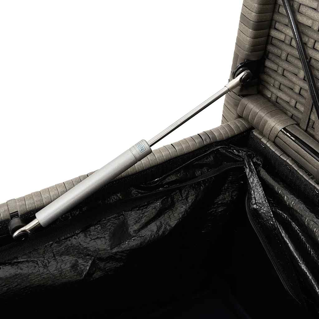 Diese Sitzbank bietet nicht nur eine bequeme Sitzgelegenheit im Außenbereich, sondern eignet sich auch perfekt, um Gartenkissen, Gartengeräte, Handtücher und andere Gegenstände ordentlich und griffbereit aufzubewahren. Langlebiges Material: PE-Rattan, auch als Poly Rattan bekannt, ist ein robustes, pflegeleichtes synthetisches Material, das die Optik von natürlichem Rattan aufweist. Es kennzeichnet sich durch ein geringes Eigengewicht und lässt sich einfach reinigen. Aufgrund seiner Haltbarkeit und Witterungsbeständigkeit wird es häufig bei der Herstellung von Gartenmöbeln verwendet.Stauraum: Der Gartenhocker verfügt über einen Stauraum an der Unterseite, der mit einem wasserfesten Beutel zur Aufbewahrung von Kissen, Spielzeug und anderen Gegenständen ausgestattet ist. Der innere Beutel kann mit Klettverschlüssen sicher am Sitz befestigt werden, was für Stabilität sorgt und Bewegungen verhindert.Sicheres und einfaches Öffnen und Schließen: Die Gasfeder erleichtert das Öffnen des Deckels und verhindert das Einklemmen der Finger.Bequemes Sitzerlebnis: Dieser Gartensessel mit dick gepolsterten Kissen bietet ein angenehmes Sitzgefühl.Abnehmbarer und waschbarer Bezug: Diese Sitzkissen verfügen über abnehmbare Bezüge für einfaches Waschen und Pflegen. Gut zu wissen:Wir empfehlen dir, deine Gartenmöbel mit einer wasserdichten Hülle zu schützen, um lange Zeit eine ansprechende Optik aufzuweisen.