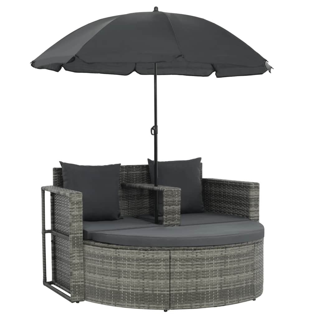Diese Gartensofa-Garnitur bestehend aus einem 2-Sitzer-Sofa, einer Fußstütze und einem Sonnenschirm, kombiniert Stil, Design und Funktionalität. Sie wird das absolute Highlight in Ihrem Garten oder auf Ihrer Terrasse sein! Dank des wasserfesten PE-Rattans ist das Sofa-Set pflegeleicht, strapazierfähig und für den täglichen Gebrauch geeignet. Das Gartenmöbel-Set verfügt über einen robusten Stahlrahmen, der sehr langlebig und stabil ist. Der UV-beständige Sonnenschirm schützt Sie vor schädlichen UV-Strahlen. Der Fußhocker kann abgenommen werden, damit Sie es bequemer haben. Die dicken, abnehmbaren Kissen mit Schaumstofffüllung sorgen für ultimativen Sitz- und Liegekomfort. Die Kissenbezüge können leicht abgenommen und gewaschen werden. Dieses Lounge-Set muss zusammengebaut werden. Hinweis: Wir empfehlen, das Set bei Regen, Schnee oder Frost abzudecken.