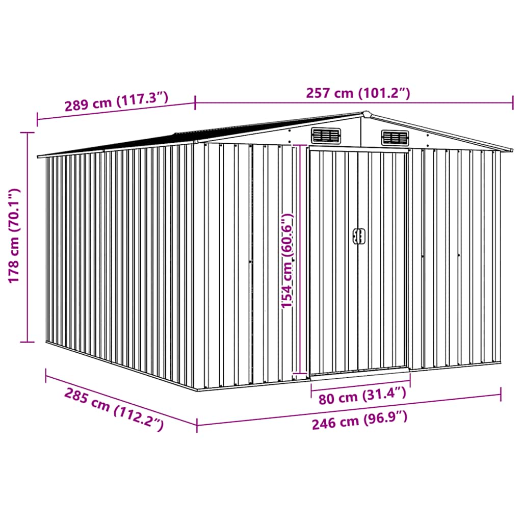 Der Geräteschuppen aus Metall eignet sich perfekt für die Aufbewahrung einer Vielzahl von Werkzeugen, Geräten, Gartenmöbeln usw. Der Gartenschuppen bietet nicht nur Schutz vor Staub und Schmutz, sondern auch vor Wind, Sonne und Niederschlag. Dieses Gerätehaus hat sowohl vorne als auch hinten Lüftungsgitter, die eine hervorragende Belüftung gewährleisten. Seine Doppel-Schiebetüren an der Vorderseite ermöglichen einen einfachen Ein- und Ausstieg. Dank der verzinkten Stahlkonstruktion und der pulverbeschichteten Oberfläche ist der Geräteschuppen langlebig und robust. Der Garten-Lagerschuppen muss zusammengebaut werden.