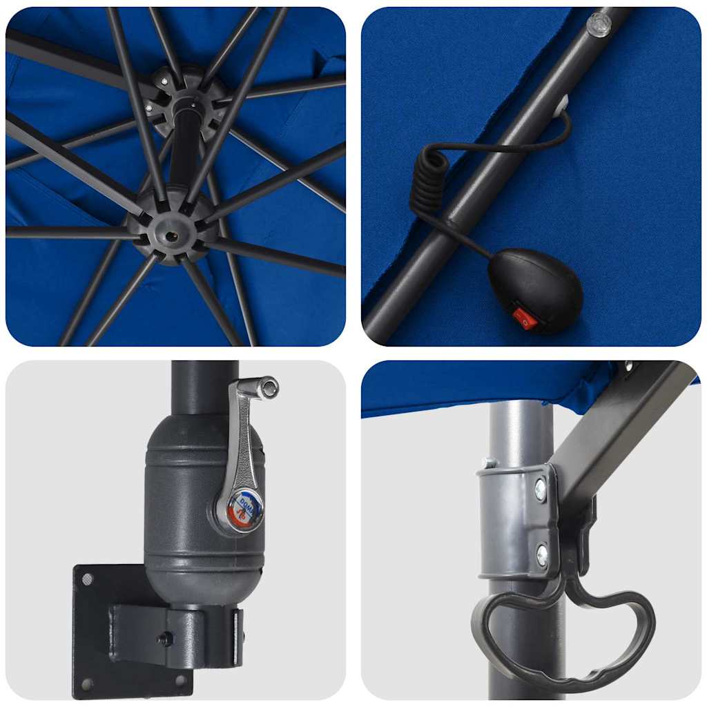 Dieser Gartenparasols ist genau das, was du suchst, um im Sommer kühl im Schatten zu bleiben. Er sieht stylisch aus und passt perfekt in moderne Gärten, sieht aber auch in traditionelleren Umgebungen gut aus. Er ist ideal für deine Sitz- oder Essbereiche, mit einem großen Schirmdach, das dich vor der Sonne schützt. Der glatte Polyesterstoff verleiht ihm eine schöne Note, und der robuste Stahlrahmen sorgt dafür, dass er lange hält. Polyesterstoff: Dieses Schirmdach ist aus hochwertigem Polyester gemacht, das hervorragend wasserabweisend ist und UV-Schutz bietet. Es blockiert starke Sonneneinstrahlung, sodass du dich entspannt zurücklehnen kannst. Das schicke Finish macht ihn zu einem stylischen Accessoire für jeden Außenbereich. Verstellbare Eigenschaften: Mit einer Handkurbel kannst du diesen Schirm ganz einfach öffnen und schließen. Die Neigefunktion erlaubt es dir, das Schirmdach optimal zu positionieren, um den besten Schutz zu haben. Diese praktischen Funktionen machen es leicht, den Schirm nach deinen Wünschen anzupassen. Integrierte LED-Beleuchtung: Die solarbetriebenen LED-Leuchten an der Unterseite des Schirmdachs sorgen für eine schöne Stimmung bei Abendveranstaltungen. Sie sind energieeffizient und verleihen deinem Außenbereich eine angenehme Atmosphäre, ohne dass du zusätzliche Stromquellen oder unordentliche Kabel brauchst. Pulverbeschichteter Stahlrahmen: Der stabile Stahlrahmen ist für den Einsatz im Freien konzipiert und sorgt für solide Stabilität und Langlebigkeit. Die Pulverbeschichtung schützt ihn vor Rost und lässt ihn gut aussehen. So wird der Schirm dir jahrelang Schatten spenden. Einfache Pflege: Halte ihn frisch mit ein paar einfachen Pflegemaßnahmen. Es ist klug, eine Abdeckung zu verwenden, wenn du ihn nicht brauchst, und das Schirmdach mit einer wasserabweisenden Sprühbehandlung zu versehen. Diese kleinen Schritte helfen, den Schirm in Topform zu halten, damit er dir lange Schatten und Licht bietet.
