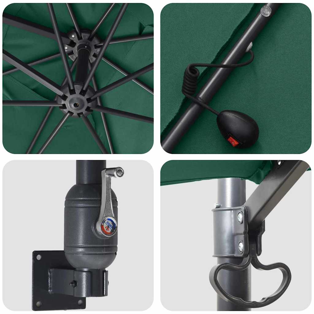 Dieser Gartenparasols ist genau das, was du suchst, um im Sommer kühl im Schatten zu bleiben. Er sieht stylisch aus und passt perfekt in moderne Gärten, sieht aber auch in traditionelleren Umgebungen gut aus. Er ist ideal für deine Sitz- oder Essbereiche, mit einem großen Schirmdach, das dich vor der Sonne schützt. Der glatte Polyesterstoff verleiht ihm eine schöne Note, und der robuste Stahlrahmen sorgt dafür, dass er lange hält. Polyesterstoff: Dieses Schirmdach ist aus hochwertigem Polyester gemacht, das hervorragend wasserabweisend ist und UV-Schutz bietet. Es blockiert starke Sonneneinstrahlung, sodass du dich entspannt zurücklehnen kannst. Das schicke Finish macht ihn zu einem stylischen Accessoire für jeden Außenbereich. Verstellbare Eigenschaften: Mit einer Handkurbel kannst du diesen Schirm ganz einfach öffnen und schließen. Die Neigefunktion erlaubt es dir, das Schirmdach optimal zu positionieren, um den besten Schutz zu haben. Diese praktischen Funktionen machen es leicht, den Schirm nach deinen Wünschen anzupassen. Integrierte LED-Beleuchtung: Die solarbetriebenen LED-Leuchten an der Unterseite des Schirmdachs sorgen für eine schöne Stimmung bei Abendveranstaltungen. Sie sind energieeffizient und verleihen deinem Außenbereich eine angenehme Atmosphäre, ohne dass du zusätzliche Stromquellen oder unordentliche Kabel brauchst. Pulverbeschichteter Stahlrahmen: Der stabile Stahlrahmen ist für den Einsatz im Freien konzipiert und sorgt für solide Stabilität und Langlebigkeit. Die Pulverbeschichtung schützt ihn vor Rost und lässt ihn gut aussehen. So wird der Schirm dir jahrelang Schatten spenden. Einfache Pflege: Halte ihn frisch mit ein paar einfachen Pflegemaßnahmen. Es ist klug, eine Abdeckung zu verwenden, wenn du ihn nicht brauchst, und das Schirmdach mit einer wasserabweisenden Sprühbehandlung zu versehen. Diese kleinen Schritte helfen, den Schirm in Topform zu halten, damit er dir lange Schatten und Licht bietet.
