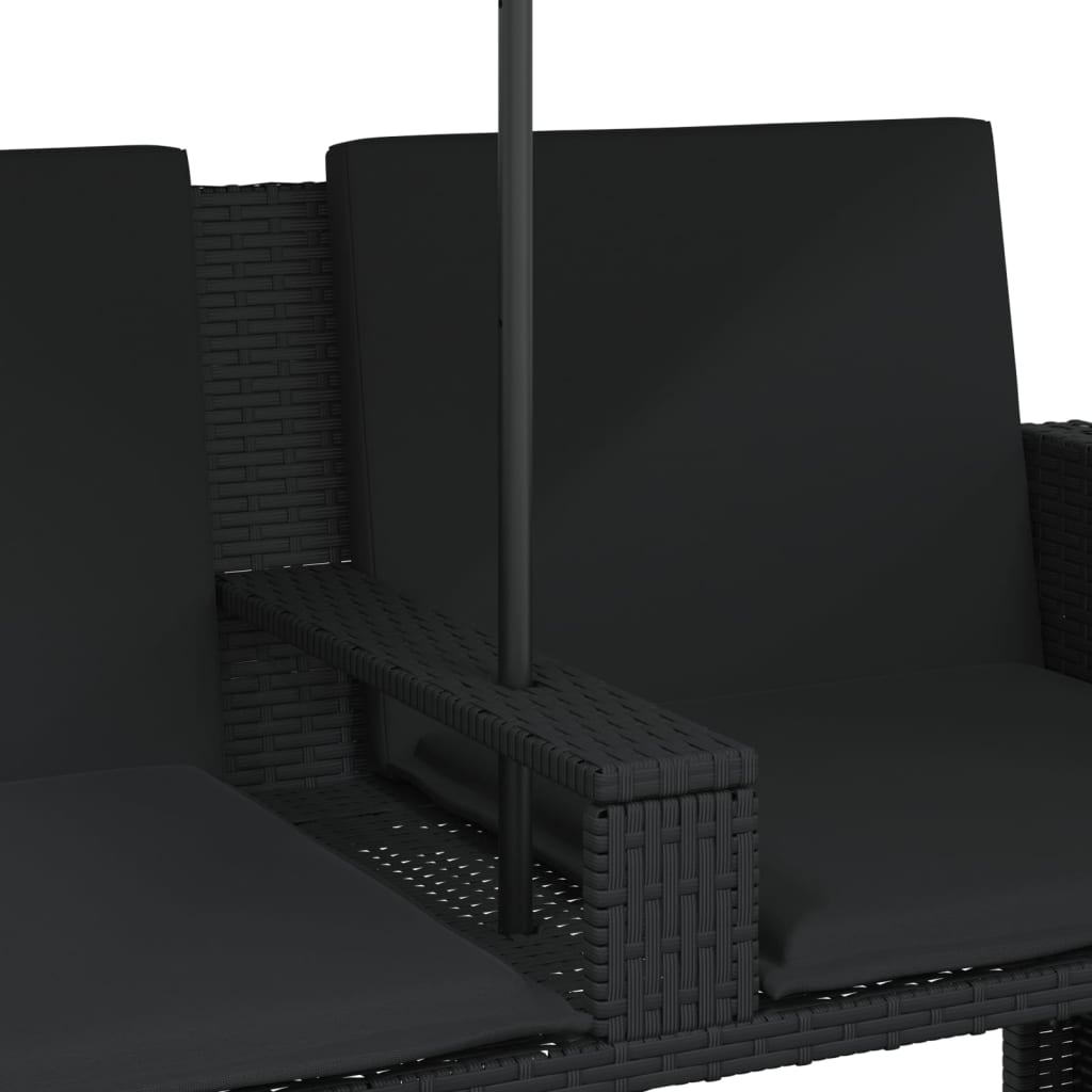 Dieses Outdoor-Sofa mit Sonnenschirm und Hockern ist die perfekte Ergänzung zu deinem Garten, deiner Terrasse oder deinem Innenhof. Er bietet einen bequemen und einladenden Platz, um mit Familie und Freunden zu plaudern oder einfach nur zu relaxen und das Leben im Außenbereich zu genießen. Langlebiges Material: PE-Rattan, auch als Poly Rattan bekannt, ist ein robustes, pflegeleichtes synthetisches Material, das die Optik von natürlichem Rattan aufweist. Es kennzeichnet sich durch ein geringes Eigengewicht und lässt sich einfach reinigen. Aufgrund seiner Haltbarkeit und Witterungsbeständigkeit wird es häufig bei der Herstellung von Gartenmöbeln verwendet.Praktischer Sonnenschirm: Das Gartensofa verfügt über einen Sonnenschirm mit Kippmechanismus, der sich einfach verstellen lässt, um in jedem Winkel Schatten und Schutz vor der Sonne zu bieten.Abnehmbarer und waschbarer Bezug: Diese Kissen haben abnehmbare Bezüge für einfache Reinigung und Pflege.Kompakte Aufbewahrung: Die Fußhocker können platzsparend unter den Sitzen verstaut werden.Robuster und stabiler Rahmen: Dank des pulverbeschichteten Stahlrahmens ist das Möbelstück robust, stabil und für den täglichen Einsatz im Außenbereich geeignet. Gut zu wissen:Wir empfehlen dir, deine Gartenmöbel mit einer wasserdichten Hülle zu schützen, um lange Zeit eine ansprechende Optik aufzuweisen.