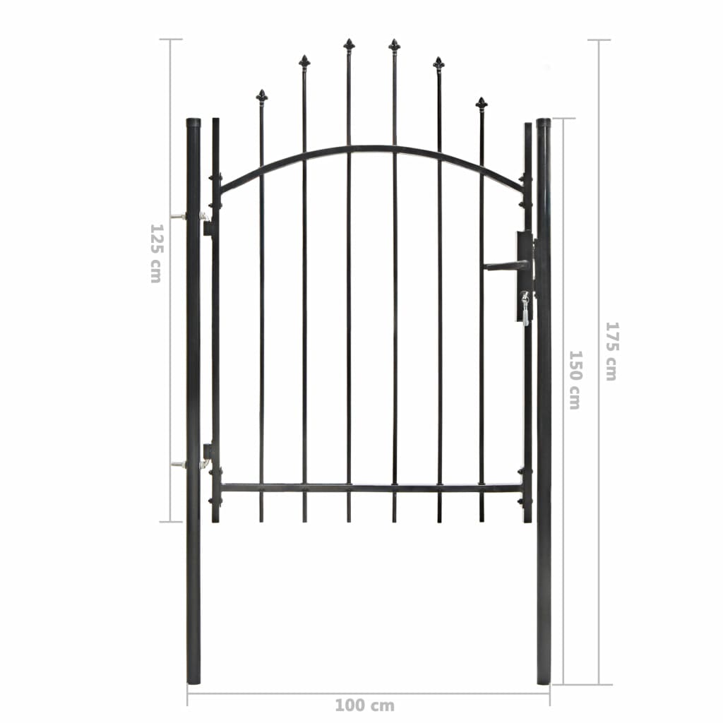 Dieses Gartentor im zeitgenössischen Stil dient als praktischer Eingang zu Ihrem Garten, der von der Außenwelt dadurch abgegrenzt wird. Das äußerst stabile und langlebige Zauntor kann eine sichere Absperrung für Ihren Garten, Innenhof oder Ihre Terasse bilden. Mit seiner eleganten, gewölbter Spitze und den robusten, horizontalen Streben zur Verstärkung des Rahmens bietet unser Gartentor Sicherheit und bildet einen fabelhaften Eingang zu Ihrem Grundstück. Das aus strapazierfähigem Stahl gefertigte Tor ist pulverbeschichtet und somit gegen Rost und Korrosion geschützt. Dieses Zauntor ist mit einem Verriegelungssystem ausgestattet und verfügt über zwei stabile Pfosten sowie robuste Scharniere, die für eine einfache Installation sorgen. Dieses Gartentor ist eine großartige Kombination aus Stil, Stärke und Stabilität!