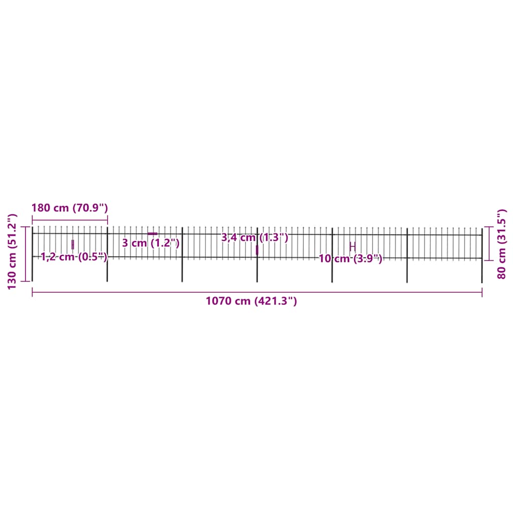 Bilden Sie einen eleganten Zaun rund um Ihren Garten, Ihr Zuhause oder Ihren Eingang! Dieser dekorative Gartenzaun aus Stahl besteht aus 6 Zaunelementen und 7 Pfosten und ist insgesamt 10,2 Meter lang. Er bietet Ihnen eine stabile, sichere und pflegeleichte Abgrenzung für Ihr Privat- oder Geschäftsgrundstück. Die vertikalen Stangen mit Speerspitzen und einer horizontalen Stütze für zusätzliche Stabilität bieten Ihnen ein hohes Maß an Sicherheit. Hergestellt aus robustem, pulverbeschichtetem Stahl, ist der Zaun sehr stabil, robust und langlebig. Dank des mitgelieferten Montagezubehörs lässt sich der Zaun auch ganz einfach montieren. Hinweis: Sie können mehrere Zaun-Sets kaufen, um den Zaun nach Belieben zu verlängern.