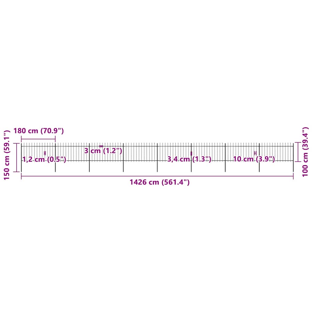 Bilden Sie einen eleganten Zaun rund um Ihren Garten, Ihr Zuhause oder Ihren Eingang! Dieser dekorative Gartenzaun aus Stahl besteht aus 8 Zaunelementen und 9 Pfosten und ist insgesamt 13,6 Meter lang. Er bietet Ihnen eine stabile, sichere und pflegeleichte Abgrenzung für Ihr Privat- oder Geschäftsgrundstück. Die vertikalen Stangen mit Speerspitzen und einer horizontalen Stütze für zusätzliche Stabilität bieten Ihnen ein hohes Maß an Sicherheit. Hergestellt aus robustem, pulverbeschichtetem Stahl, ist der Zaun sehr stabil, robust und langlebig. Dank des mitgelieferten Montagezubehörs lässt sich der Zaun auch ganz einfach montieren. Hinweis: Sie können mehrere Zaun-Sets kaufen, um den Zaun nach Belieben zu verlängern.