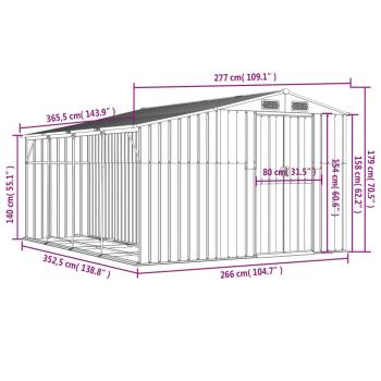 Schaffe zusätzlichen Stauraum im Freien und schütze deine Werkzeuge mit diesem multifunktionalen Gartenhaus. Robustes Material: Der Geräteschuppen besteht aus verzinktem Stahl, der rostfrei und auf eine lange Lebensdauer ausgelegt ist. Stahl ist ein außergewöhnlich hartes und starkes Material. Er bietet Robustheit und Stabilität. Die Verzinkung bietet einen besseren Schutz gegen Korrosion und eignet sich für Produkte, die im Freien und in rauen Umgebungen eingesetzt werden.Reichlich Stauraum: Dieses Metallhaus mit Brennholzunterstand bietet reichlich Platz, um Brennholz, Gartengeräte, Möbel, Ausrüstung und vieles mehr zu lagern.Bequeme Griffe: Die Tür des Gerätehauses ist mit Griffen versehen, die den Zugang erleichtern.Gute Belüftung: Das Gartenhaus ist mit 4 Lüftungsöffnungen ausgestattet, die für eine gute Belüftung sorgen, um die Ansammlung von Feuchtigkeit und unangenehme Gerüche im Haus zu verhindern.Schrägdach: Das Schrägdach sorgt für einen ungehinderten Wasserabfluss.