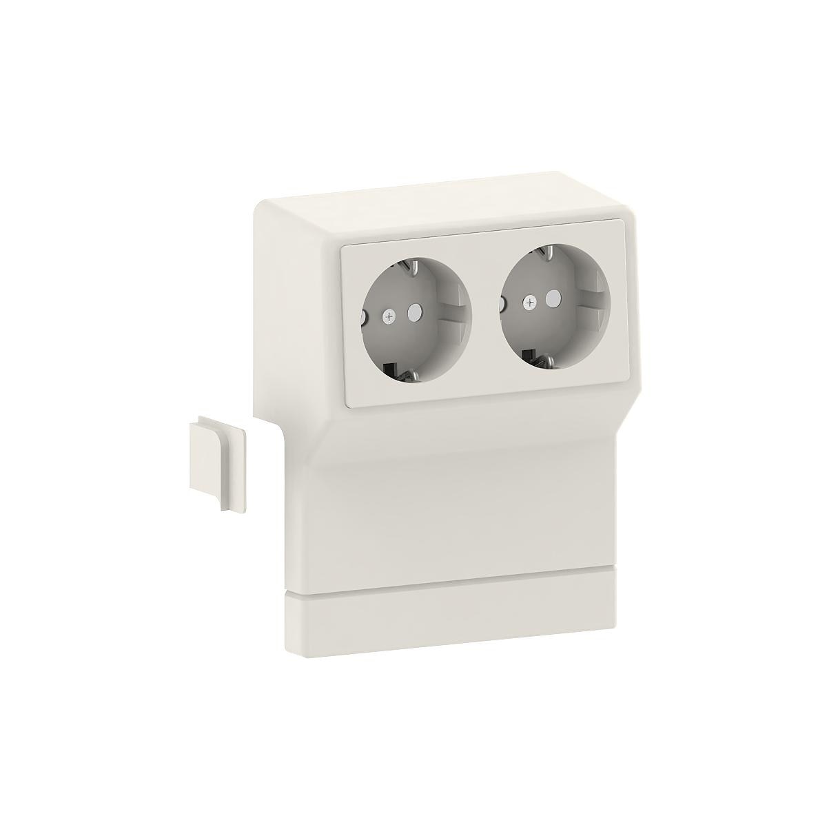 Geräteträger für den Sockelleistenkanal, Geräteträger-Unterteil vormontiert mit einer 2-fach vorverdrahteten Steckdose mit erhöhtem Berührungsschutz und vier Befestigungspunkten zum Verschrauben oberhalb des Sockelleistenkanal-Unterteils. Mit Hilfe der beiliegenden Ausgleichsstücke ist der Geräteträger für beide Profilhöhen der Sockelleistenkanäle (SL 20x50 und SL 20x70) einsetzbar. nHinweis: Die Oberteile der Sockelleistenkanäle lassen sich seitlich unter die Abdeckung des Geräteträgers schieben, wodurch die Abdeckung des Geräteträgers eine schnittkaschierende Funktion für die Oberteile der Sockelleistenkanäle leistet.