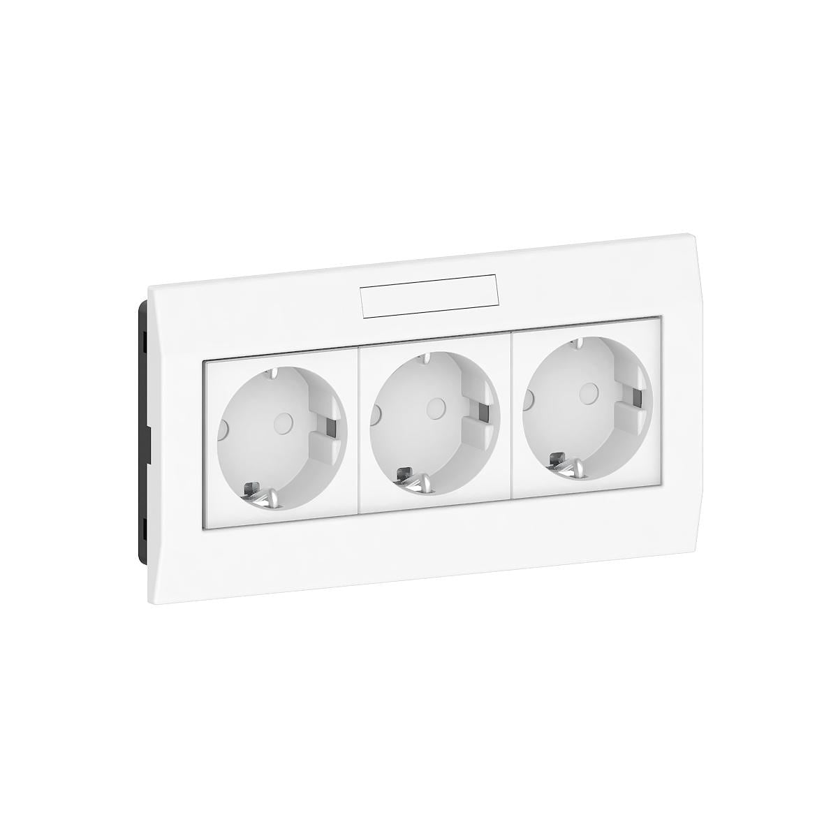 Vorkonfektionierte 3-fach Steckdoseneinheit, bestehend aus Montageträger, Abdeckrahmen mit Beschriftungsfeld 8x40mm und einer 3-fach M45 Steckdose 0° gerade, Leitungsanschluss über Steckklemmen, 2-polig, 16 A/250 V~, mit Verbindungsklemmen nach VDE 0620, geeignet für 3 Winkel- oder Flächenstecker, mit erhöhtem Berührungsschutz gemäß VDE 0620, zur Installation in Brüstungskanälen mit einer 76,5 mm breiten Befestigungsspur, für die waagerechte Geräteinstallation.nHinweis: Die Zugentlastung ist separat zu bestellen.