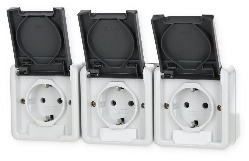 Gira 478930 SCHUKO-Dreifachsteckdose 16 A 250 V~ waagerecht mit Klappdeckel WG AP, Grau