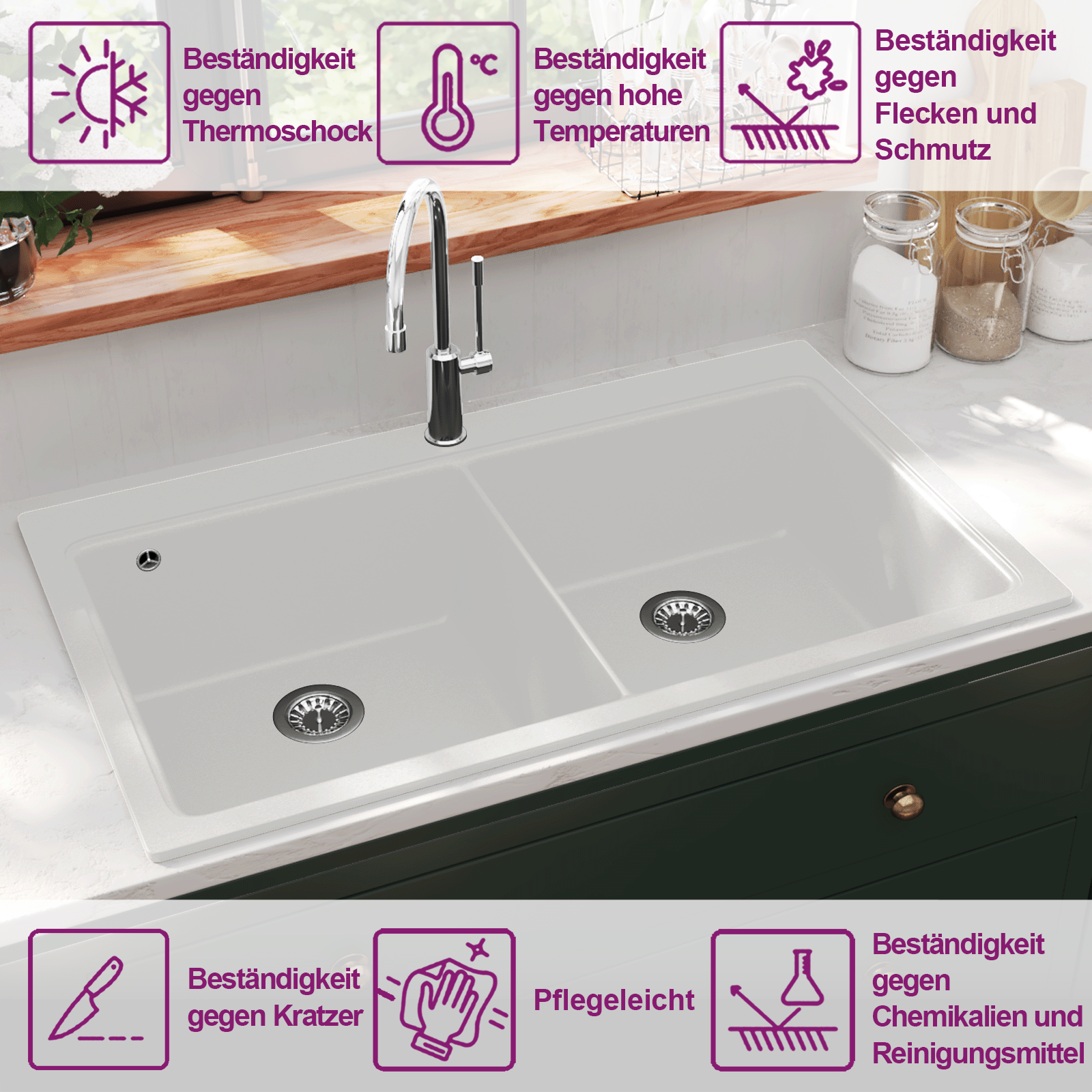 Dieses zeitgemäße, extratiefe Doppel-Spülbecken hat ein klares, elegantes Design und ist eine vielseitige Ergänzung für Ihre Küche. Diese Küchenspüle ist aus hochwertigem Granit hergestellt und somit nicht nur äußerst langlebig, sondern auch unempfindlich gegenüber Stößen und Kratzern - also hervorragend für die täglichen Belastungen in der Küche geeignet! Die glatte, pflegeleichte Oberfläche ist schmutzabweisend, Flecken und Kalkablagerungen werden dadurch deutlich reduziert. Die Einbauspüle ist hitzebeständig bis 280 °C. Dieses Doppelbecken ist ein echtes Raumsparwunder, sodass Sie mehr von Ihrem Arbeitsbereich haben. In den beiden extratiefen Spülbecken finden auch größere Geschirrteile und Kochgerätschaften mühelos Platz. Das zweite Becken kann als abgeteilter Bereich völlig flexibel genutzt werden.Im Lieferumfang ist auch ein Siebkörbchen enthalten, um gröberen Schmutz beim Abwaschen aufzufangen. Die Montage ist ganz einfach.