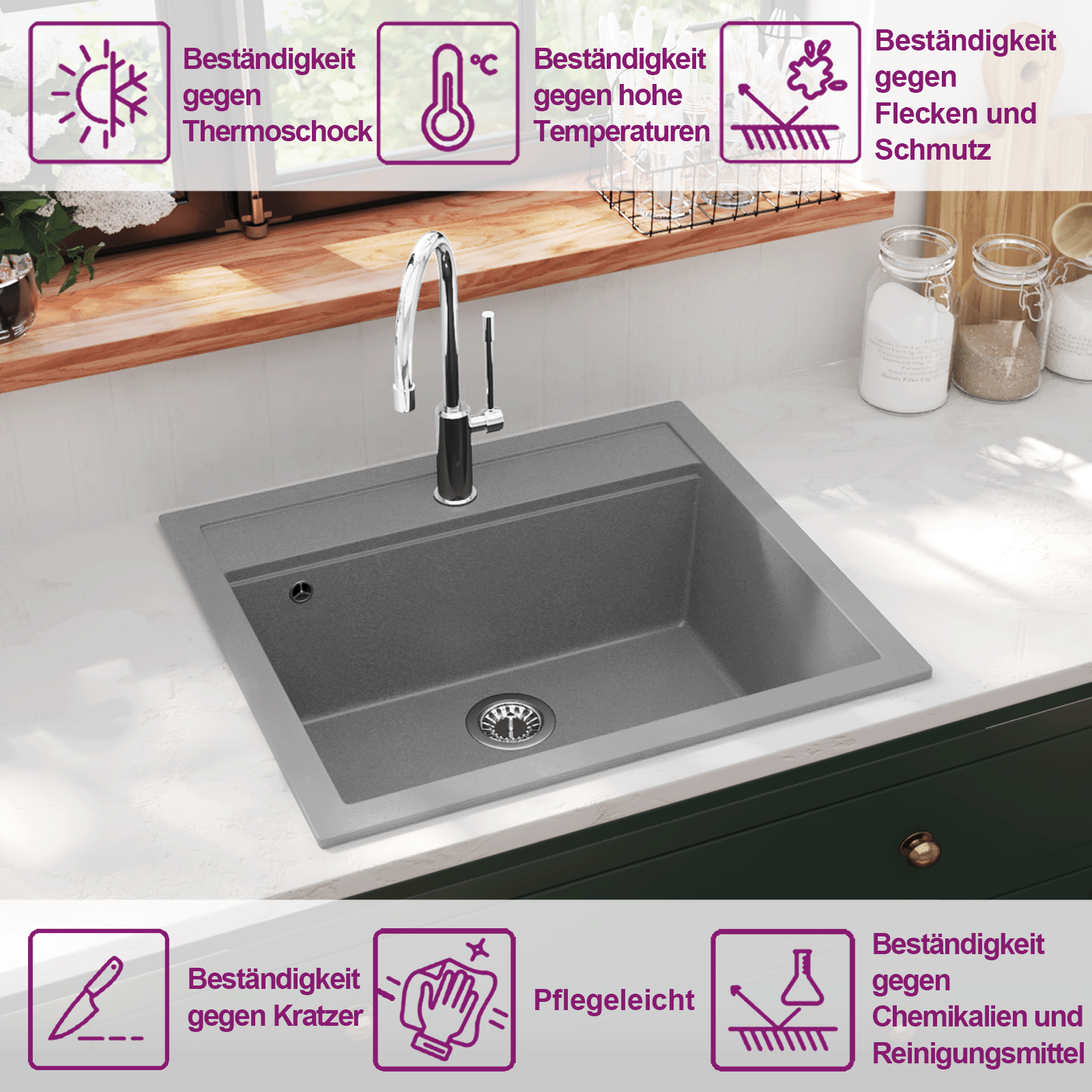 Unsere Granitspüle stellt eine zeitlose Bereicherung für Ihren Küchendekor dar. Sie verfügt über ein einzelnes, extra tiefes Becken und ein elegantes Design. Dank qualitativ hochwertigem Granit ist das Spülbecken nicht nur hitzebeständig, kratzbeständig und schlagfest, sondern lässt sich auch ganz einfach reinigen. Im Lieferumfang ist auch ein Siebkörbchen enthalten, um gröberen Schmutz beim Abwaschen aufzufangen. Die Montage der Spüle ist einfach.