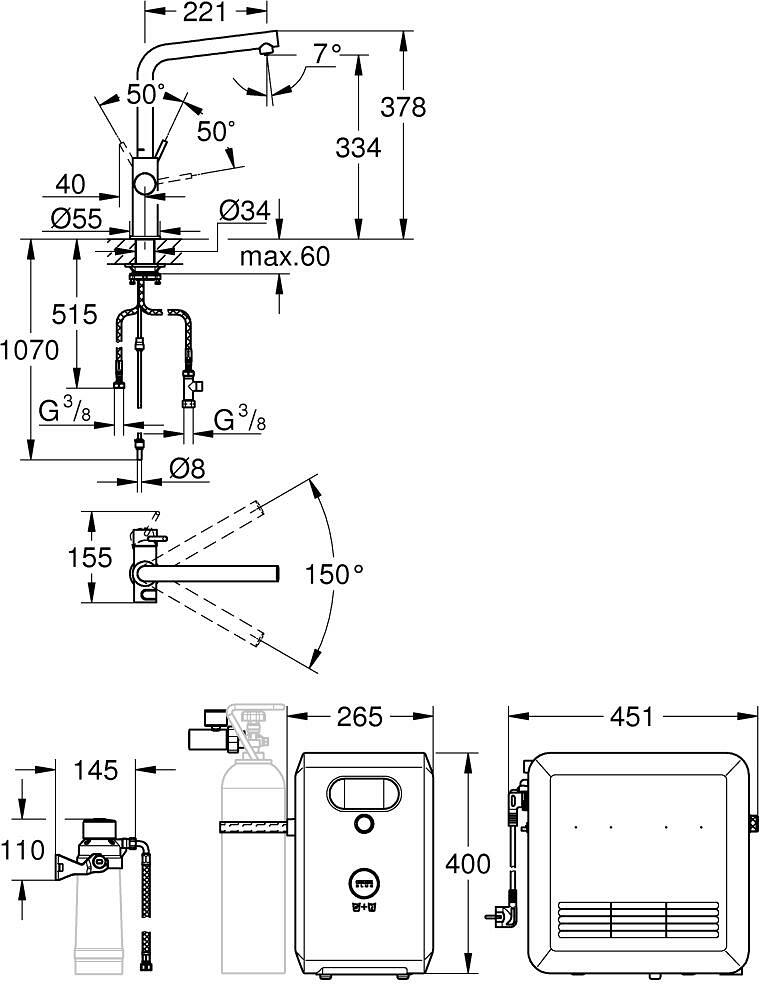 Der für die Inbetriebnahme notwendige GROHE Blue Filter, die 2 kg CO? Flasche (40 423 000) und die Reinigungskartusche (40 434 001) sind nicht im Lieferumfang enthalten und müssen separat bestellt werden