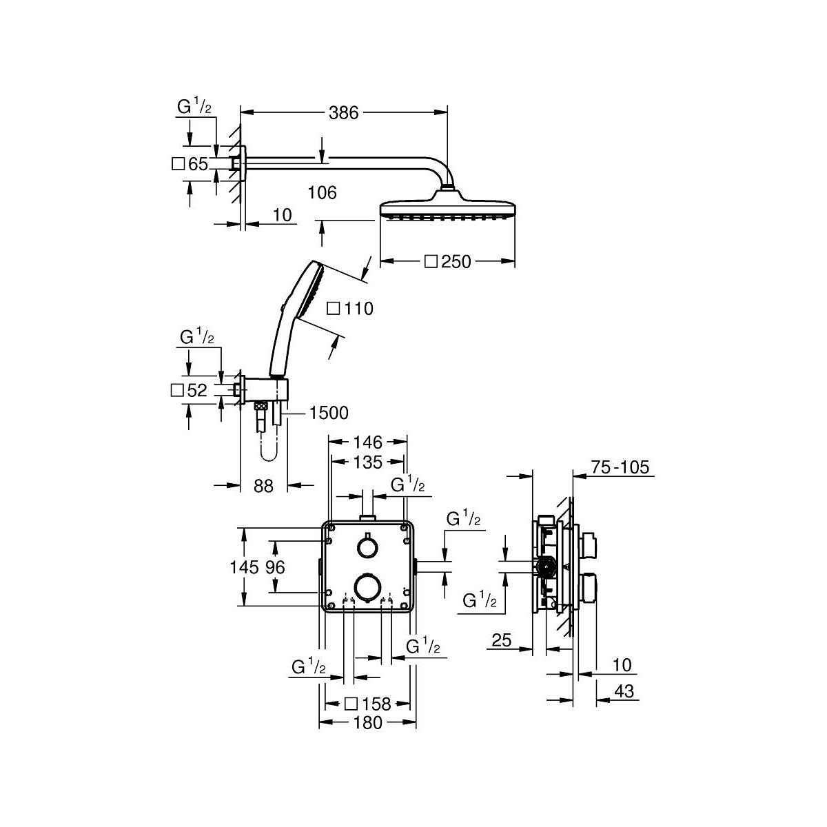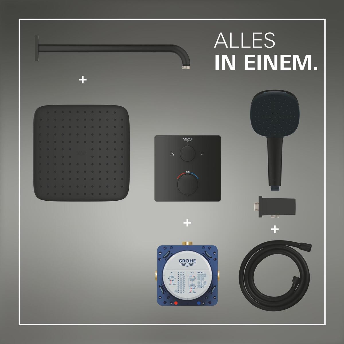 Ein herausragendes Design und intelligente Funktionen in einer Komplettlösung ? das ist das GROHE Precision Unterputz-Duschsystem in edlem Matt Black. Der GROHE Precision Thermostat überzeugt in Kombination mit dem Rapido SmartBox Universal-Einbaukörper für die Unterputzmontage mit absoluter Spitzenleistung. Die GROHE TurboStat Technologie sorgt für einen konstanten Wasserfluss bei perfekter Temperatur. Die GROHE Water Saving Wasserspartechnologie senkt den Wasser- und Energieverbrauch ? ganz ohne Abstriche bei der Leistung. Zudem ist das System familienfreundlich: Mit dem GROHE SafeStop Temperaturbegrenzer kann die Temperatur nicht versehentlich höher als 38 °C eingestellt werden ? so gehören Verbrühungen der Vergangenheit an. Für noch mehr Sicherheit lässt sich mit dem optionalen GROHE SafeStop Plus ein absoluter Grenzwert von 43 °C einstellen. Die GROHE AquaDimmer Funktion bietet eine präzise Steuerung mit nur einer einfachen Bewegung. Damit lässt sich der Wasserstrahl nach Wunsch lenken und gleichzeitig das Wasservolumen steuern. Die 250 × 250 mm große Kopfbrause, die an einem 380 mm langen Brausearm montiert ist, gibt den sanften, entspannenden Rain Strahl aus. Die 110 × 110 mm große Handbrause kann sowohl den entspannenden Rain Strahl als auch den kräftigen, konzentrierten Jet Strahl ausgeben. Zwischen den Strahlarten wechseln Sie ganz einfach mit dem innovativen GROHE SmartSwitch Umsteller. Dazu enthält das Set eine Halterung mit Brauseabgang und einen 1500 mm langen Brauseschlauch mit TwistStop Design. Die GROHE DreamSpray Technologie garantiert einen gleichmäßigen Wasserfluss aus allen Silikondüsen, die mit SpeedClean ganz einfach mit dem Finger von Kalkablagerungen befreit werden können. Die langlebige GROHE Long-Life Oberfläche ist einfach zu reinigen und sorgt dafür, dass die Garnitur auch nach vielen Jahren im Gebrauch strahlt und glänzt. Außerdem ist die Montage des Reglers mit GROHE FastFixation mit Verriegelungssystem, abgedeckter Rosette und Schaftabdichtung ganz einfach. So besteht keine Gefahr, dass die Anschlüsse lecken. Das erstklassige GROHE Precision Unterputz-Duschsystem ? die komfortable Lösung für eine luxuriöse Dusche mit zuverlässiger Leistung