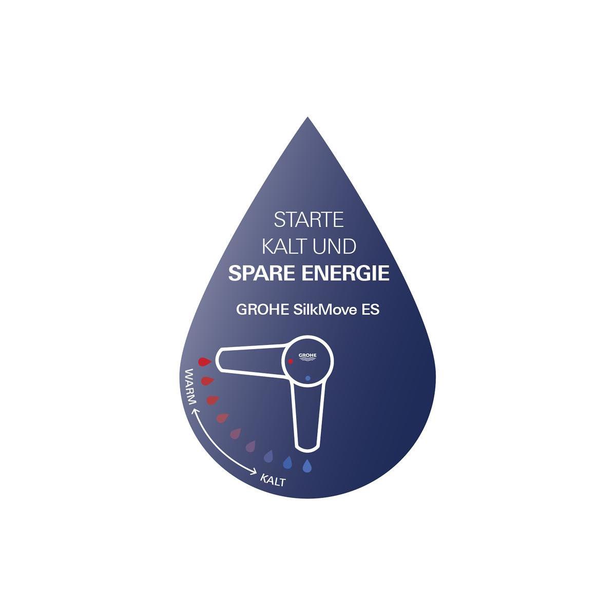 GROHE SilkMove® ES zeichnet sich neben der einzigartigen Leichtgängigkeit durch einen gleichzeitig verantwortungsvollen Umgang mit wertvollen Energieressourcen aus. Die integrierte Energiesparfunktion, die in der Hebel-Mittelstellung ausschließlich den Zufluss von Kaltwasser erlaubt, bietet eine zeitgemäße Nutzung von Energie. Der unnötige Zulauf von Warmwasser wird vermieden und spart so bares Geld. Der großzügige Betätigungswinkel des Hebels durch Bewegung aus der Mittelstellung nach links ermöglicht bei Bedarf den Zufluss von Warmwasser mit einer besonders sanften und präzisen Feinabstimmung von Wasserfluss und Temperaturregelung.