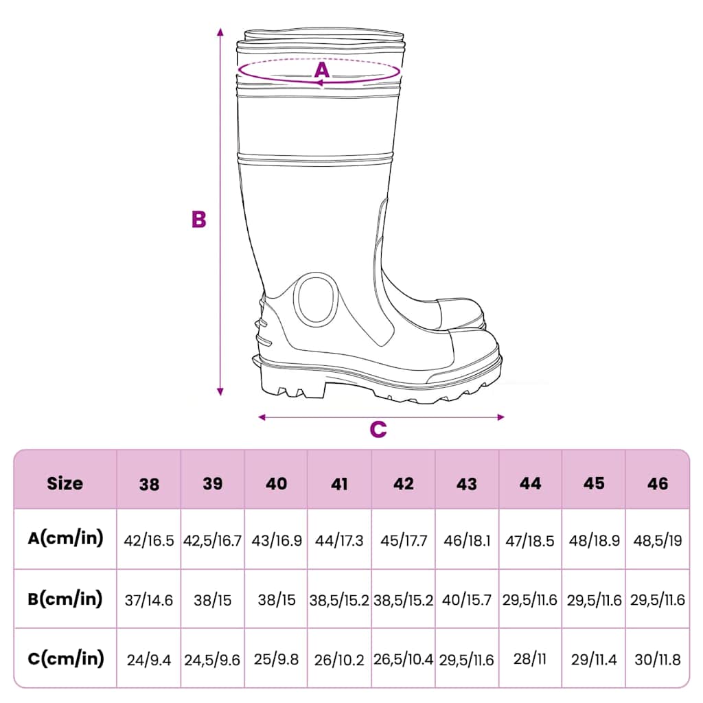 Die Gummistiefel bieten eine ideale Passform und optimalen Komfort. Sie eignen sich ideal für regnerische Bedingungen und halten deine Füße trocken. Wasserdicht und langlebig: Die Regenstiefel bestehen aus PVC, das wasserdicht ist. Sie schützen deine Füße vor Schmutz und halten sie trocken. Aufgrund ihrer Haltbarkeit lassen sie sich auch für ganztägige Spaziergänge oder zum Spielen verwenden.Rutschfest: Die Gummistiefel sind mit Strukturmustern an den Sohlen versehen, was für mehr Stabilität sorgt und die Rutschgefahr verringert.Vielseitig einsetzbar: Die robuste Sohle bietet höchste Flexibilität auf verschiedenen Geländern. Egal, ob du dein Auto gerade wäschst, dich am Strand entspannst oder durch den Garten spazierst, diese Stiefel sind der Aufgabe gewachsen. Gut zu wissen:Die Stiefel sind nicht zum Arbeiten oder für die Verwendung auf scharfen Oberflächen geeignet.
