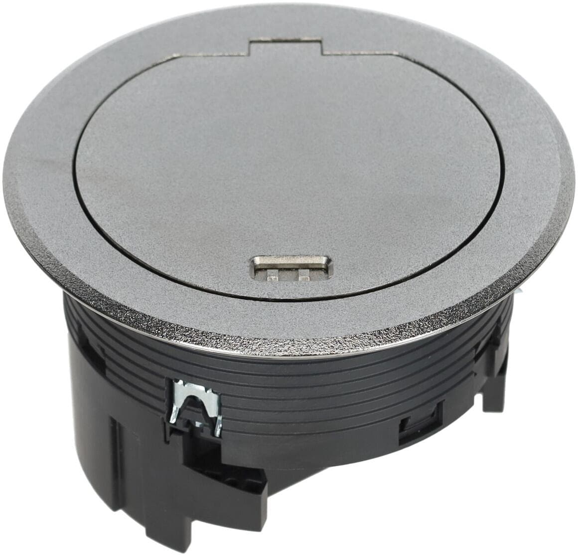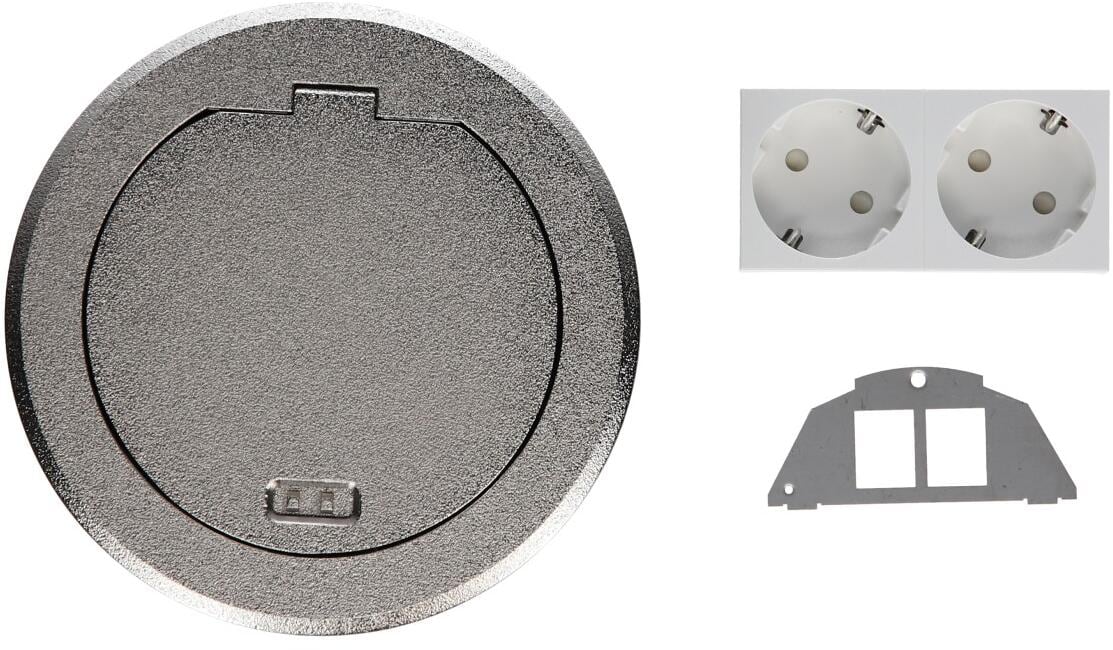 Installationsdose R02, 2x SCHUKO, Keystone Typ 01 2-f, Metall Klappdeckel silber. Bodensteckdose mit Metall Klappdeckel silber nach DIN EN 50085-1 und DIN EN 50085-2-2 inklusive Montageset.