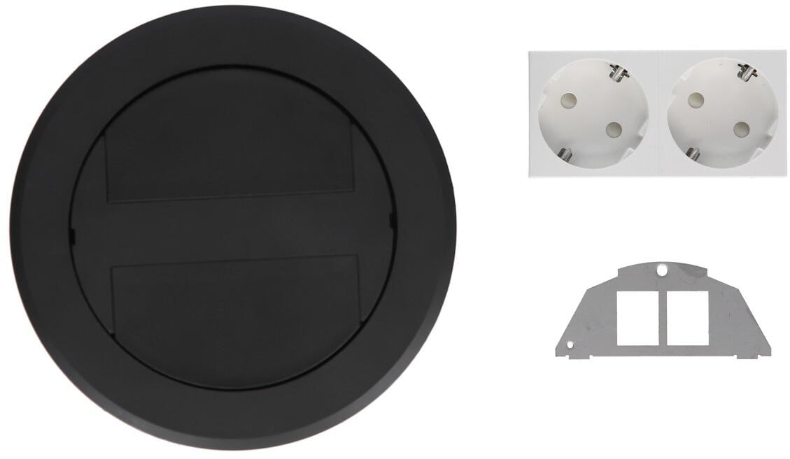 Installationsdose R02, 2x SCHUKO, Keystone Typ 01 2-f, Kunststoff Klappdeckel. Bodensteckdose Kunststoff Klappdeckel schwarz nach DIN EN 50085-1 und DIN EN 50085-2-2 inklusive Montageset, mit Teppichschutzrahmen inkl. einer 2-fach SCHUKO Steckdose und einer Montageplatte zur Aufnahme von 2 Datenanschlussbuchsen. Einsatz in trocken zu pflegenden Böden.