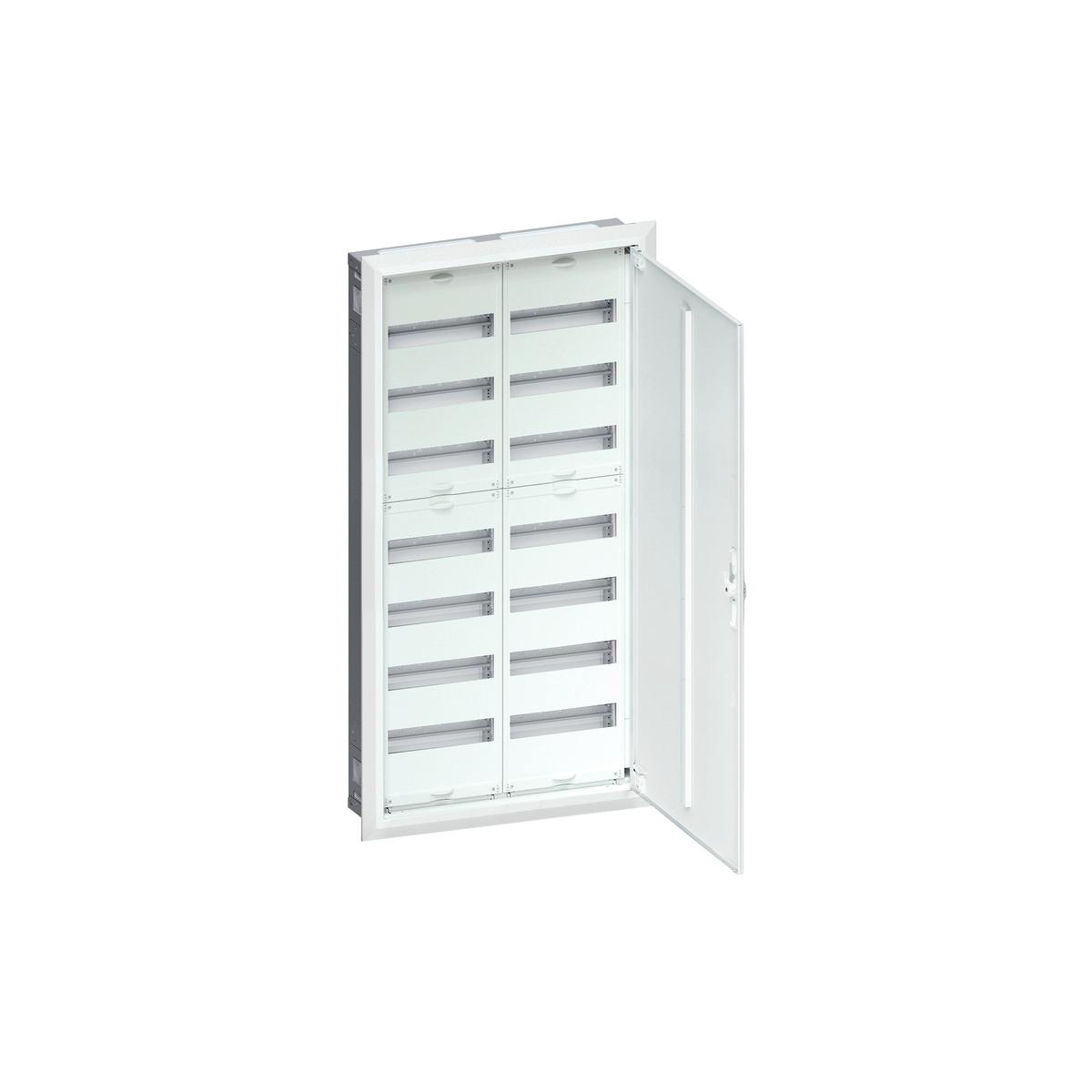 Feldverteiler Unterputz mit 168 Platzeinheiten, Schutzart IP Standard 30 und Schutzklasse II, entspricht den Normen DIN EN 61 439-1/-3 und DIN 43870. Geeignet für Geräte bis 125 Ampere. Ausgestattet mit pulverbeschichteter Stahlblechtür in RAL 9010, profilierten Tragschienen und Berührungsschutzabdeckungen. Inklusive QuickConnect-Klemmblöcke für Erdung und Neutralleiter.