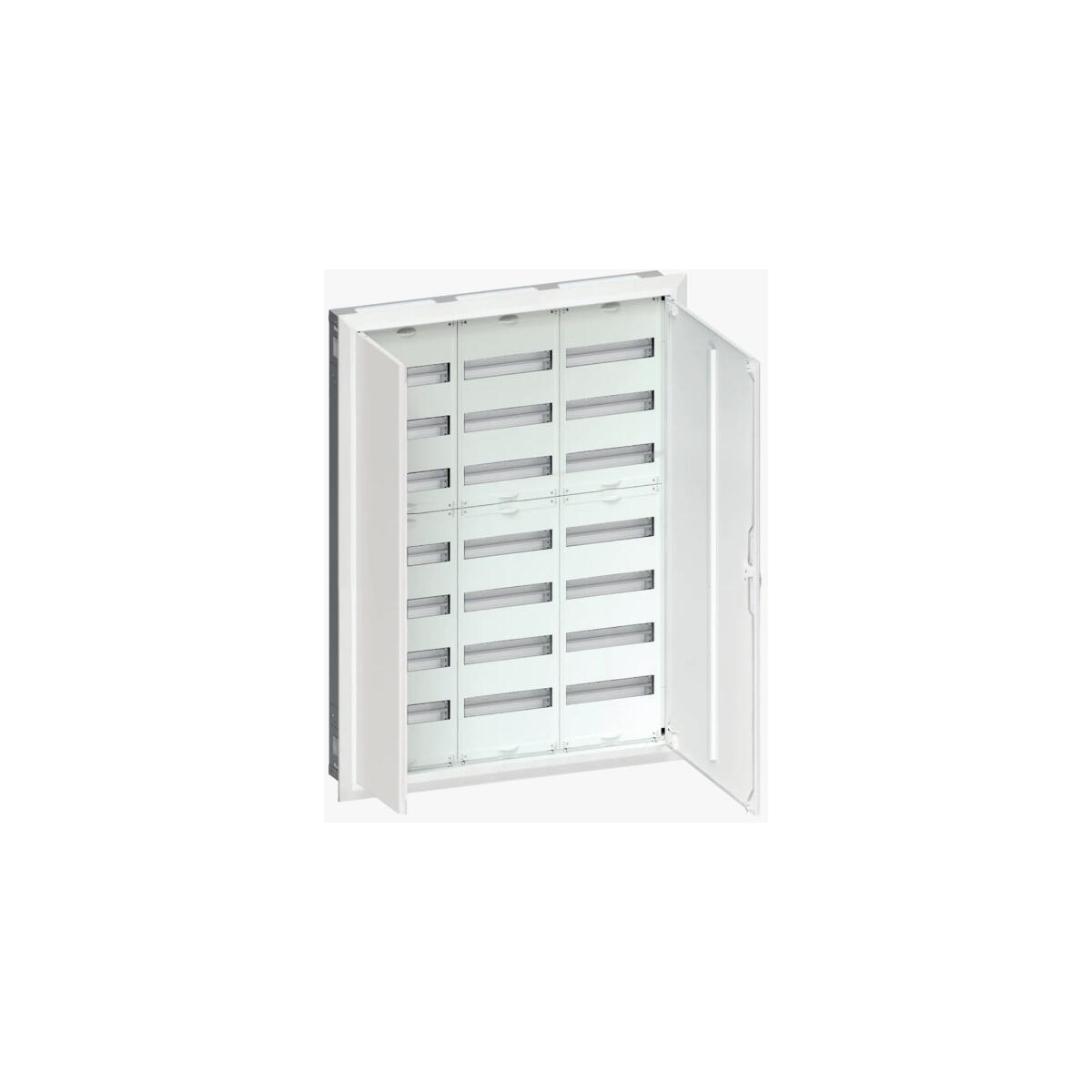 Feldverteiler Unterputz 252 Platzeinheiten, DIN EN 61 439-1/-3, DIN 43870, für Geräte bis 125 Ampere. Schutzart IP Standard 30, Schutzklasse II, Nischenmaße 1107x815x115mm. Ausstattung: pulverbeschichtete Stahlblechtür in RAL 9010, Tragschienen, Hutschienen, Berührungsschutzabdeckungen, QuickConnect-Klemmblöcke für Erdung+Neutralleiter. Leitungseinführungen oben/unten, justierbare Türscharniere, Öffnungswinkel 110°, plombierbarer Türverschluss.