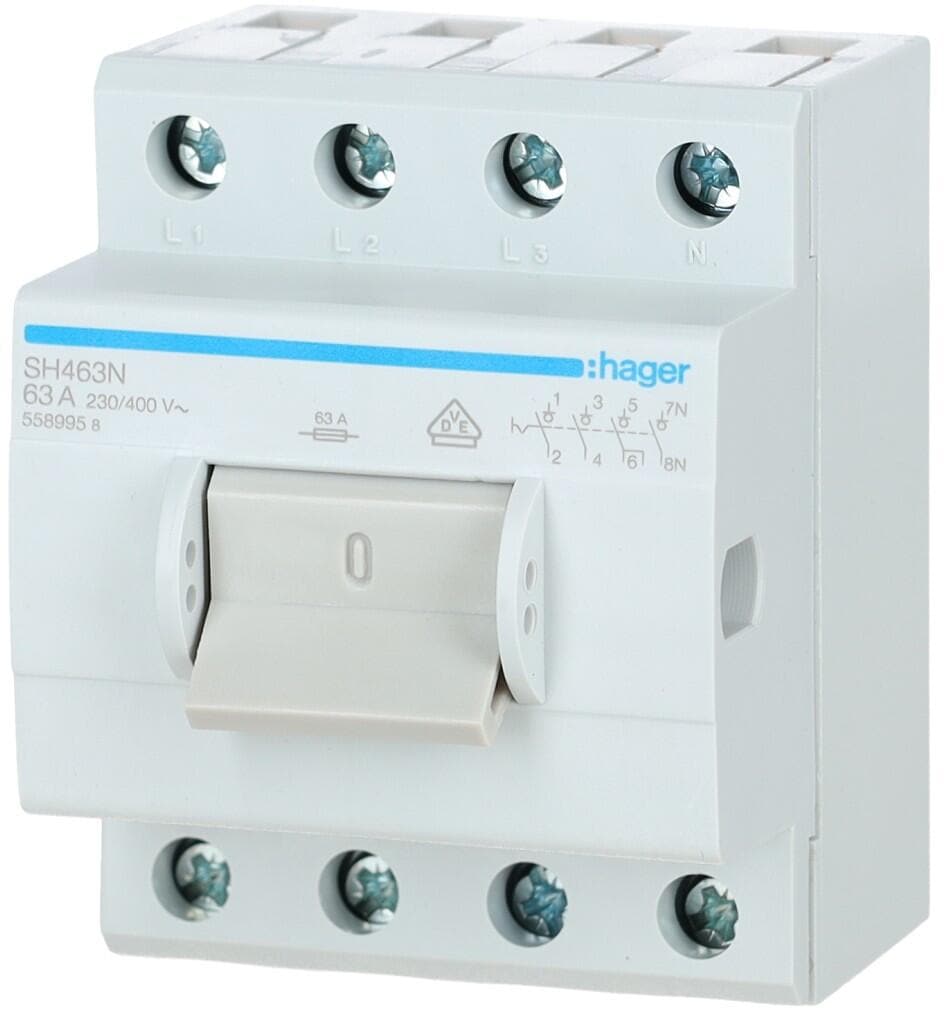 Kompaktschalter 63A, 4-polig, ermöglicht das Schalten von Strömen bis zu 63A bei 400V AC. Ausgestattet mit vier Schließern und einer Baubreite von 3,5 Platzeinheiten. Ideal für die Installation in Verteilerkästen mit begrenztem Platzangebot. Bietet zuverlässige Leistungsunterbrechung und hohe Schaltleistung.