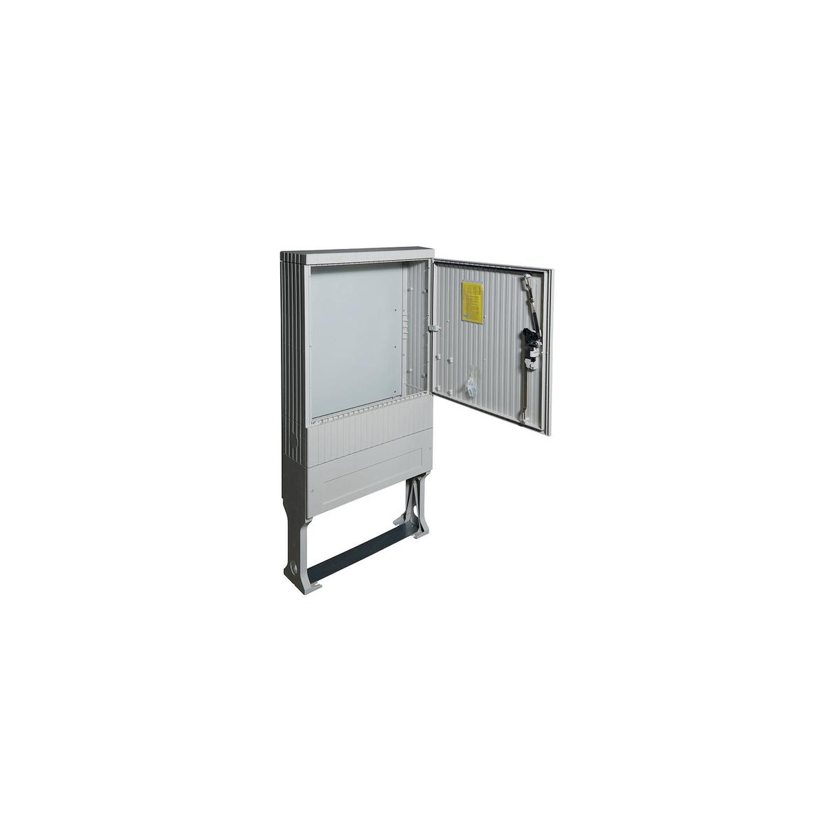 Verteilersäule nach DIN EN 61439, Schutzart IP 44, mit Eingrabsockel, aus glasfaserverstärktes Polyester FS 833.5 nach DIN EN 14598. Leersäule zum Einbau für Montageplatte, Befestigungssatz, Einbaufelder und Zählerfeld. Profiliertes Gehäuse im Rippendesign. Tür mit Öffnungswinkel 180 Grad bei freiem Stand und 90 Grad bei angereihten Gehäusen. Rechte Tür ist aushängbar. Schließung mit Schwenkhebel, Drei-Punkt-Basküleverschluss, Doppelschließung, ein Profilhalbzylindern ist eingebaut. Die Belüftung erfolgt über labyrinthartig ausgebildete Lüftungskanäle und ist durch Eindringen von Fremdkörpern stochersicher. Eingrabsockel und Verteilersäule bilden eine Einheit. Ein Bodenrost ist empfohlen. Zur Betauungsvermeidung ist der Sockel bis zur Höhe der Kabelbefestigungsschiene innen mit Sockelfüller aufzufüllen.