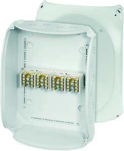 Kabelabzweigkasten aus hochwertigem Thermoplast mit Hauptleitungsabzweigklemmen für Kupferleiter. Für Aufputz-Anwendungen in Gebäuden oder die geschützte Installation im Freien. Mit Außenlaschen zur Befestigung und Deckelbefestigung über Schnellverschlüsse. Mit Hauptleitungsabzweigklemmen bis 35 mm², 4-polig. Kabeleinführung über metrische Vorprägungen in Gehäusewänden und Boden. Beigefügte Einsteckstutzen in Schutzart IP 55.