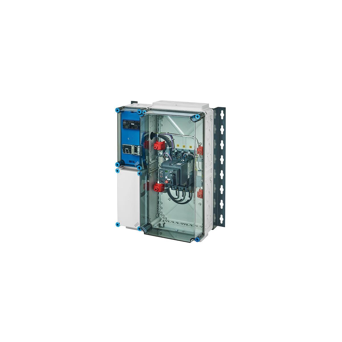 Freischaltstelle für den Anschluss von Erzeugungsanlagen an das Niederspannungsnetz sind anschlussfertige Verteilungen bis 135 kW/150 kVA entsprechend VDE-AR-N 4105 mit Kuppelschalter und NA-Schutz. Die Gehäuse aus hochwertigem Thermoplast sind schutzisoliert. Schutzart IP 54/IP 65. Sie sind für die geschützte Installation im Freien geeignet und UV-beständig. Freischaltstelle für Erzeugungsanlagen für BHKW, Photovoltaik- und Windkraftanlagen. Bemessungsleistung 63 kW/70 kVA, für 4/5-Leiter-TN-Netz. Kuppelschalter mit 1 Leistungsschalter mit Motorantrieb, 3-polig. Deckelverschlüsse für Werkzeugbetätigung, plombierbar. Wandbefestigung mit Montageschienen.