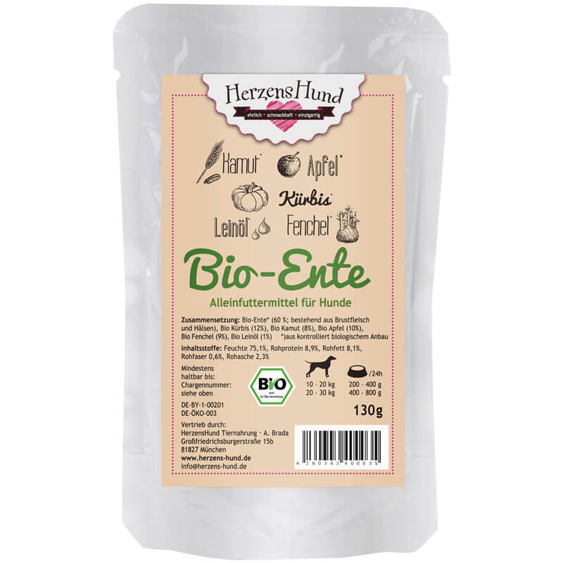 Bio-Ente mit Bio-Gemüse -getreidefrei-Entenfleisch bietet einen ausgewogenen Fettgehalt und ist auch für Seniorenhunde oder Welpen zu empfehlen. Bei der Zusammensetzung des Fleischanteils steht hochwertiges Brustfleisch ganz vorne, das wichtige Proteine bietet. Doch auch Herz und Leber sorgen für einen Vitamin-Boost mit viel Vitamin A und B-Vitaminen sowie Aminosäuren. Fein gewolfte Karkasse und Hälse liefern Calcium. Im Apfel stecken über 30 Vitamine und Mineralstoffe. Fenchel kann durch seine ätherischen Öle beruhigend auf Magen und Darm wirken und stärkt durch Thiamin Nerven und Herz.Zusammensetzung:Bio-Ente 65 % (bestehend aus 80 % Brustfleisch, 5 % Herzen, 5 % Hälse, 5 % Karkasse, 5 % Leber), Bio-Kürbis 14 %, Bio-Apfel 11 %, Bio-Fenchel 9 %, Bio-Leinöl 1 %.Analytische Bestandteile:Feuchte 78,33 %, Rohprotein 8,3 %, Rohfett 7,7 %, Rohfaser 0,5 %, Rohasche 2,0 %, Ca 4,5 g/kg, P 2,8 g/kg.Energie / kcal pro 100 g: 106.39 kcal.Fütterungsempfehlung:Erwachsene Hunde sollten in der Regel 1-2 Mal pro Tag gefüttert werden. Welpen benötigen häufigere Mahlzeiten, oft 3-4 Mal pro Tag.Die tägliche Futtermenge sollte entsprechend dem Energiebedarf und dem Körpergewicht des Hundes angepasst werden. Es ist wichtig, das Gewicht und den Körperzustand regelmäßig zu überwachen und die Futtermenge bei Bedarf anzupassen.Frisches Wasser sollte immer verfügbar sein. Inverkehrbringer: HerzensHund Tiernahrung GbR, Otto-Lederer-Weg 7, 81827 München, Tel.: 0179/7503906, Fax: 089/99964398, E-Mail: info@herzens-hund.de
