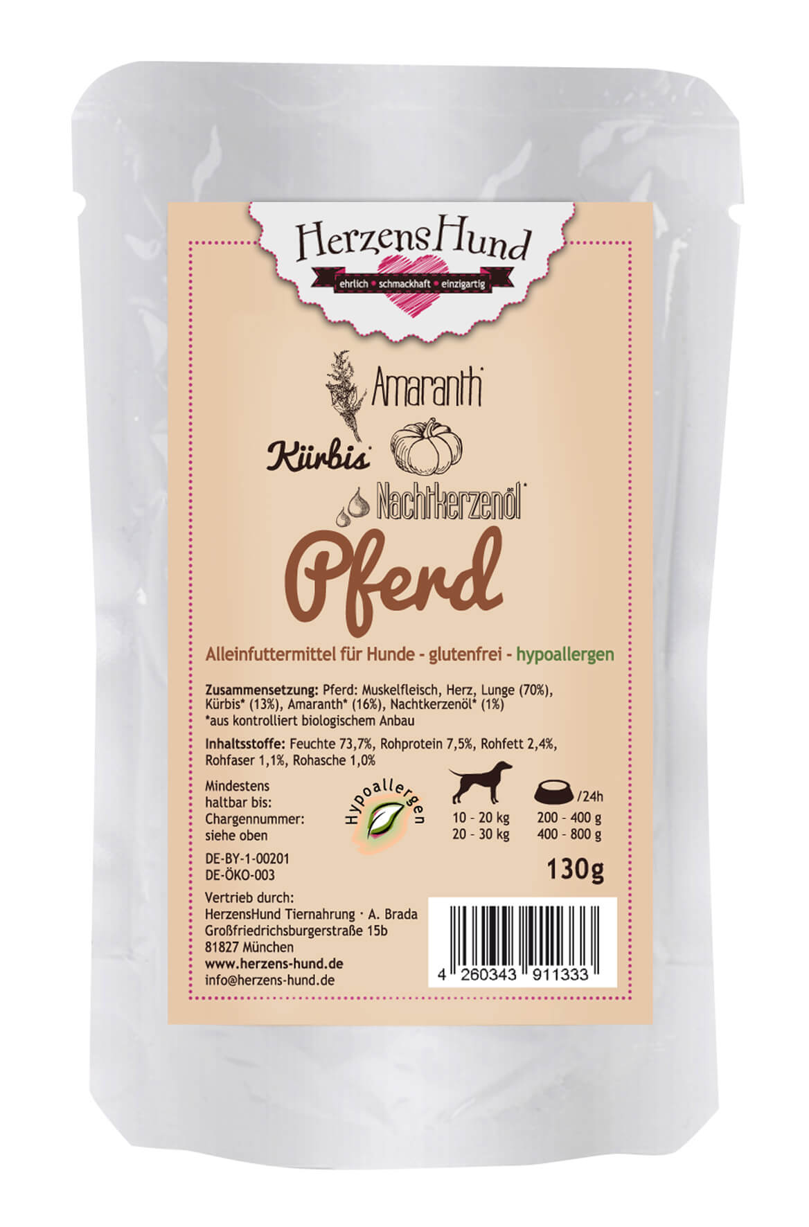 Getreidefreies Hundefutter Pferd mit Kürbis -getreidefrei-Ehrlich – weil Herzenshunde Ehrlichkeit verdient habenPremium Ergänzungsfuttermittel für erwachsene Hunde – getreidefrei / glutenfrei- Unsere getreidefreien Menüs haben alle einen sehr hohen Fleischanteil, kombiniert mit frischem Obst oder Gemüse.- Sie sind zudem laktosefrei, enthalten wenig ausgesuchte Zutaten und eignen sich besonders gut für Hunde mit Futtermittelunverträglichkeit.- Wir verzichten bewusst auf synthetische Zusätze. Daher deklarieren wir unser Futter als Ergänzungsfuttermittel entsprechend den gesetzlichen Vorgaben.- Natürliche Zutaten können Schwankungen im Nährstoff-Gehalt unterliegen. Wir empfehlen, unser Sortiment abwechslungsreich zu füttern.- Wir deklarieren 100 % der Zutaten, offen, ehrlich, transparent.Zusammensetzung:Pferd 78 % bestehend aus (60 % Muskelfleisch, 25 % Herz, 10 % Lunge, 5 % Leber), Bio-Kürbis 21 %, Bio-Nachtkerzenöl 1 %.Pferd ist oft für allergiegeplagte Hunde der letzte Ausweg und eine sehr bekömmliche Proteinquelle. Bei der Zusammensetzung des Fleischanteils steht hochwertiges Muskelfleisch ganz vorne, das wichtige Proteine bietet. Doch auch Herz und Leber sorgen für einen Vitamin-Boost mit viel Vitamin A und B-Vitaminen sowie Aminosäuren. Für die Sensiblen haben wir die Zutatenliste bei diesem Menü extra kurz gehalten; abgerundet wurde der hohe Fleischanteil mit nährstoffreichem Kürbis. Nachtkerzenöl mit Omega-6-Fettsäuren kann Fell und Haut guttun. Analytische Bestandteile: Feuchte 82,1%, Rohprotein 11,2 %, Rohfett 3,9 %, Rohfaser 1,1 %, Rohasche 0,6%, Ca 0,2 g/kg, P 1,0 g/kg.Fütterungsempfehlung ab dem 2. Monat für Ihren Herzenshund:Wir empfehlen für Ihren Herzenshund eine tägliche Futterration von 2-3 % seines Körpergewichtes. Das ist als Richtwert zu verstehen und sollte auf jedes Tier individuell abgestimmt werden, je nach Rasse, Jahreszeit, Alter, Aktivität und Stoffwechsel. Ihr Hund sollte immer genügend Wasser zur Verfügung haben.Inverkehrbringer: HerzensHund Tiernahrung GbR, Otto-Lederer-Weg 7, 81827 München, Tel.: 0179/7503906, Fax: 089/99964398, E-Mail: info@herzens-hund.de