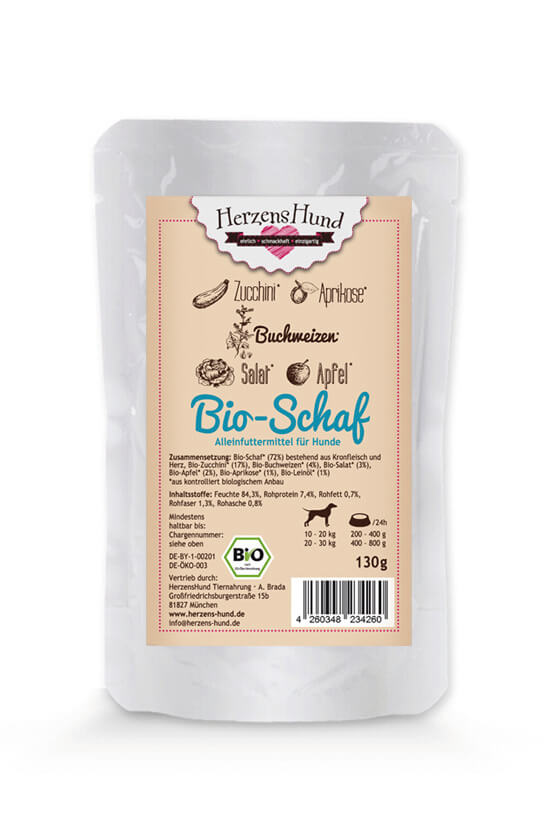Schaf mit Zucchini - getreidefreiSchaf ist gut verdaulich und mager. Bei der Zusammensetzung des Fleischanteils steht hochwertiges Muskelfleisch ganz vorne, das wichtige Proteine bietet. Doch auch Herz und Leber sorgen für einen Vitamin-Boost mit viel Vitamin A und B-Vitaminen sowie Aminosäuren. Im Apfel stecken über 30 Vitamine und Mineralstoffe, die Aprikose punktet u. a. durch Carotin, der Vorstufe zu Vitamin A. Leinöl ist besonders reichhaltig an Omega-3-Fettsäuren und sehr ausgewogen.Zusammensetzung:Schaf 72 % (bestehend aus 60 % Muskelfleisch, 25 % Herz, 10 % Lunge, 5 % Leber), Zucchini 17 %, Apfel 9 %, Aprikose 1 %, Leinöl 1 %.Analytische Bestandteile:Feuchte 79,9 %, Rohprotein 8,75 %, Rohfett 4,6 %, Rohfaser 0,4 %, Rohasche 1,3, Ca 0,4g/kg, P 1,1 g/kg.Energie / kcal pro 100 g: 83 kcalFütterungsempfehlung:Erwachsene Hunde sollten in der Regel 1-2 Mal pro Tag gefüttert werden. Welpen benötigen häufigere Mahlzeiten, oft 3-4 Mal pro Tag.Die tägliche Futtermenge sollte entsprechend dem Energiebedarf und dem Körpergewicht des Hundes angepasst werden. Es ist wichtig, das Gewicht und den Körperzustand regelmäßig zu überwachen und die Futtermenge bei Bedarf anzupassen.Frisches Wasser sollte immer verfügbar sein. Das Produktbild dient lediglich zum Zweck der Illustration und kann vom tatsächlichen Produkt abweichen.Inverkehrbringer: HerzensHund Tiernahrung GbR, Otto-Lederer-Weg 7, 81827 München, Tel.: 0179/7503906, Fax: 089/99964398, E-Mail: info@herzens-hund.de