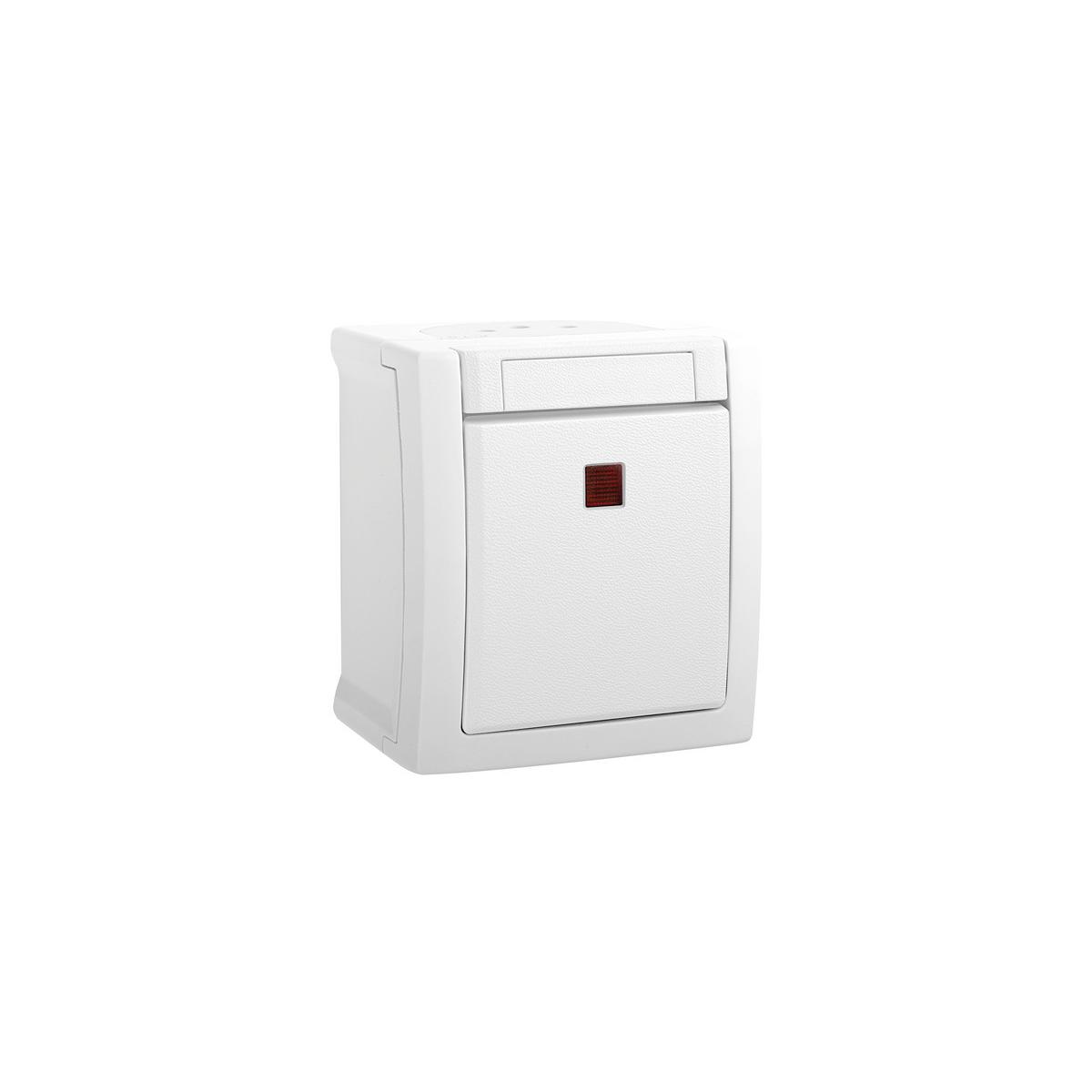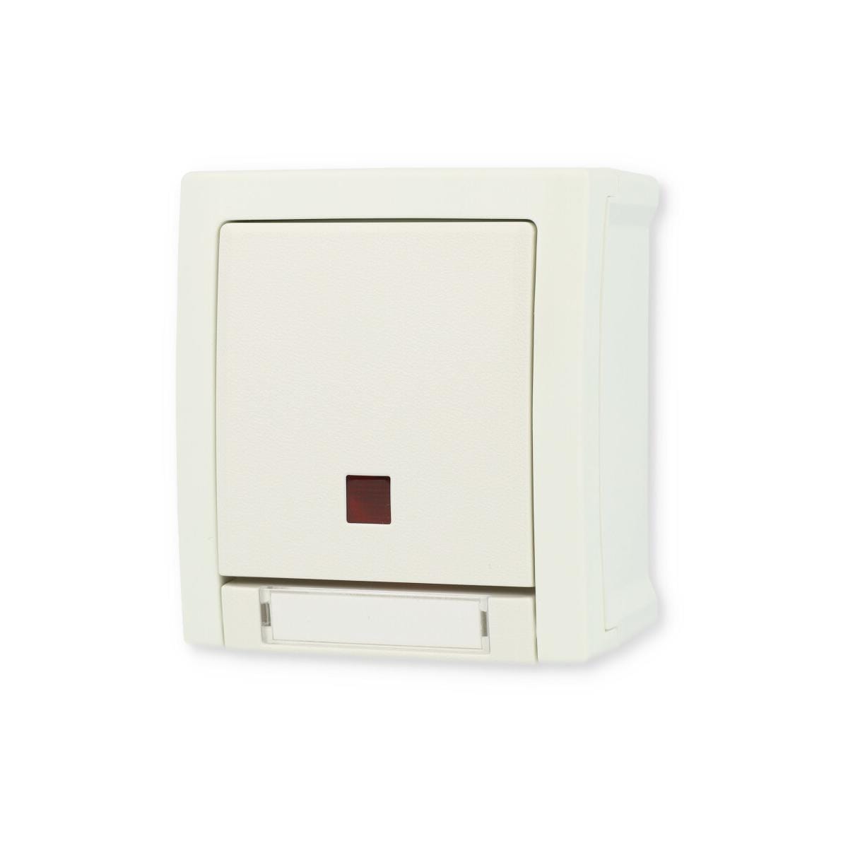 Wippschalter Ausschalter mit roter Kalotte, LED im Lieferumfang, Beschriftung als Heizung-Notschalter mit 90591301-DE möglich, mit N-Klemme, Nennspannung 250V, Nennstrom 10A, Schutzart IP54, Schlagfestigkeit IK05, Farbe weiß